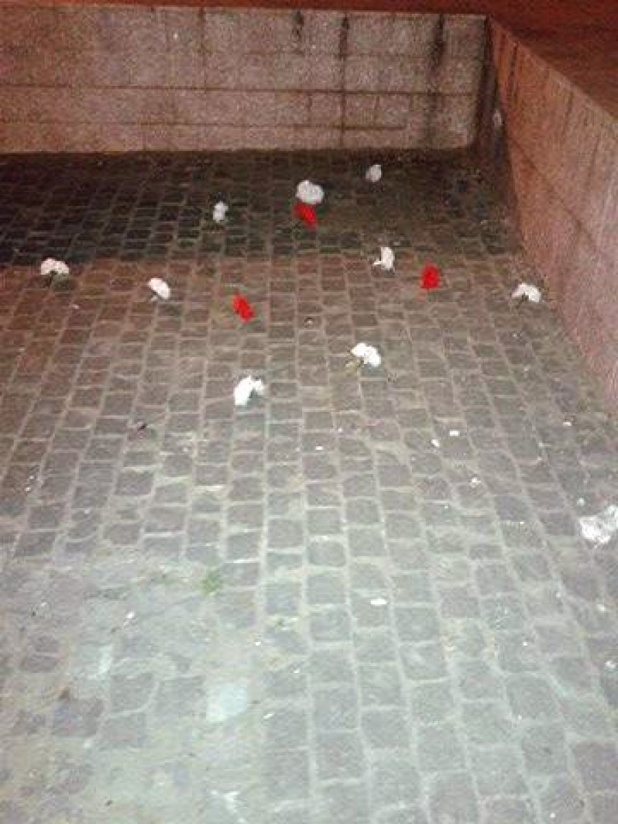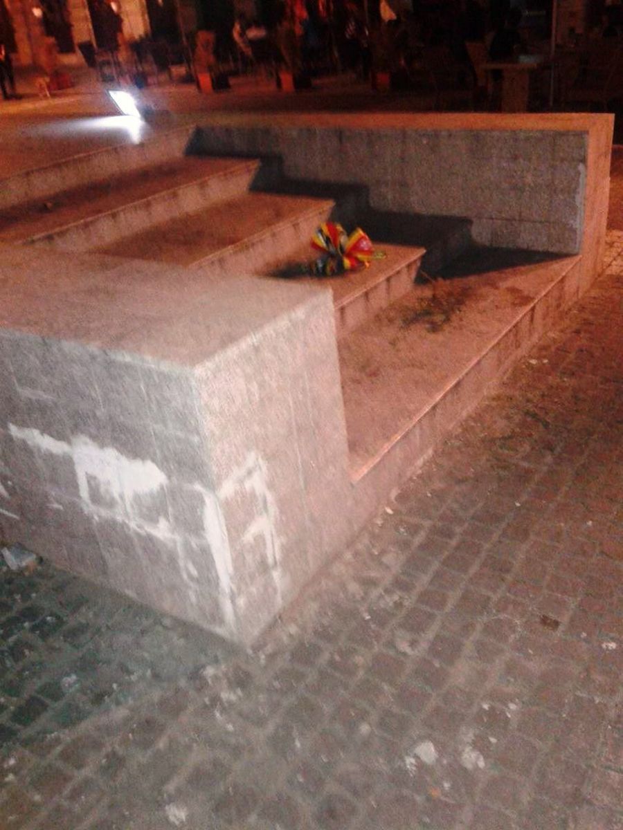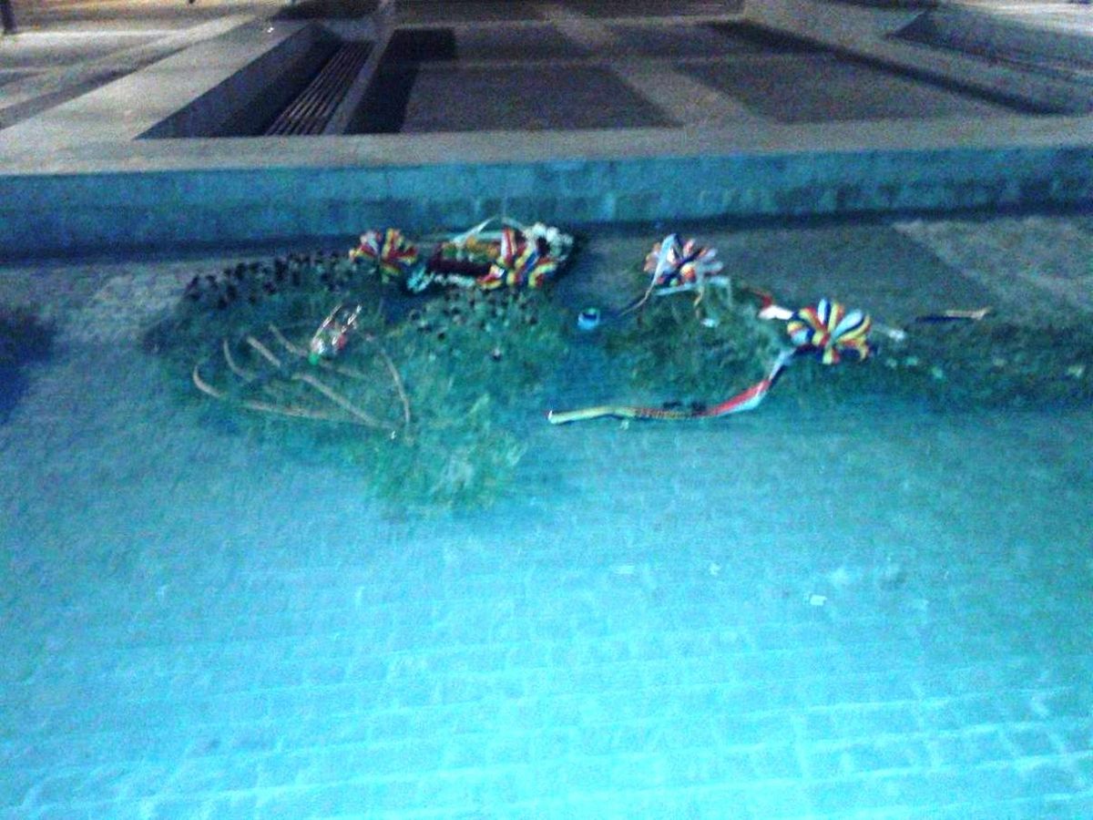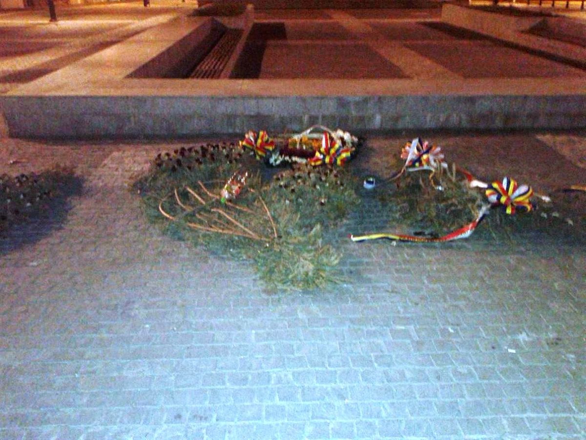 La două săptămâni după ce instituţii, asociaţii, partide au depus jerbe de flori în Piaţa 1 Decembrie 1918, acesta au fost rupte, date jos de pe monument şi călcate în picioare.