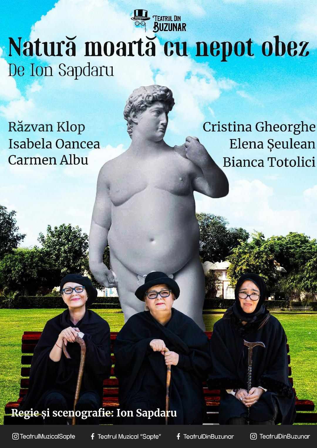 La Teatrul „Vasilache" vineri, 5 aprilie 2024, de la ora 18:00 botoșănenii sunt invitați să vizioneze un spectacol al Teatrului din Buzunar din Galați - „Natură moartă cu nepot obez", de Ion Sapdaru.