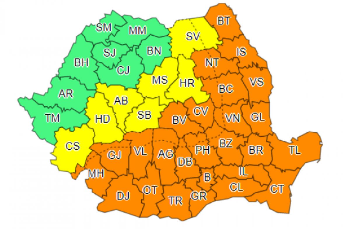 Astfel, vineri, un numar de 18 judete din regiunile mentionate si municipiul Bucuresti se vor afla sub cod portocaliu de canicula. Botoşaniul va rămâne în continuare sub Cod galben de caniculă. De asemenea, in Crisana, cea mai mare parte a Banatului, sudul Transilvaniei, nordul si centrul Moldovei, disconfortul termic va fi accentuat, iar temperaturile maxime se vor situa in general intre 33 si 36 de grade, pentru 15 judete fiind emis cod galben de canicula.