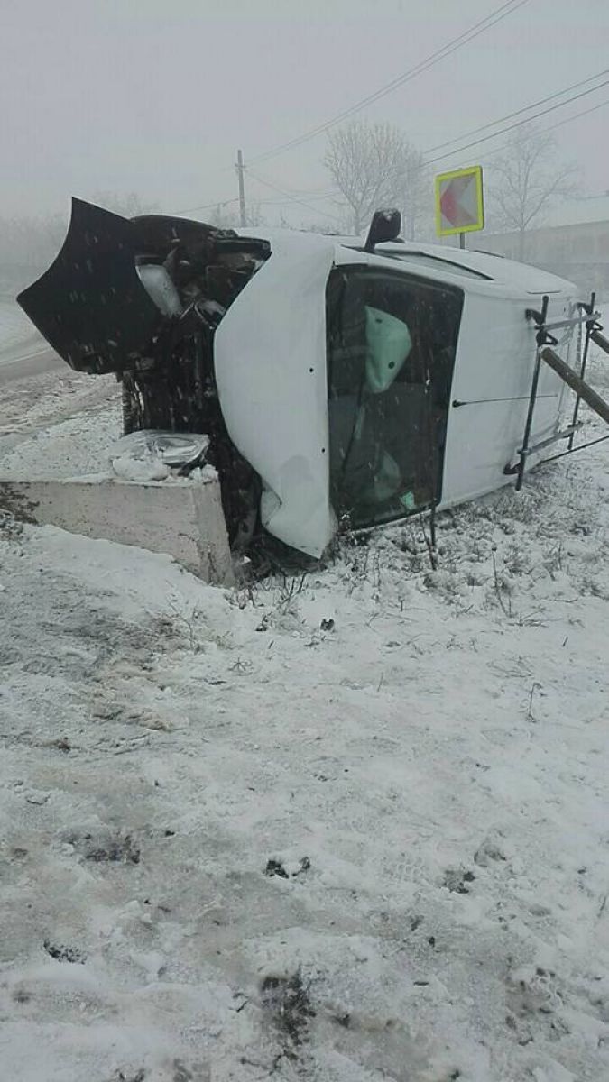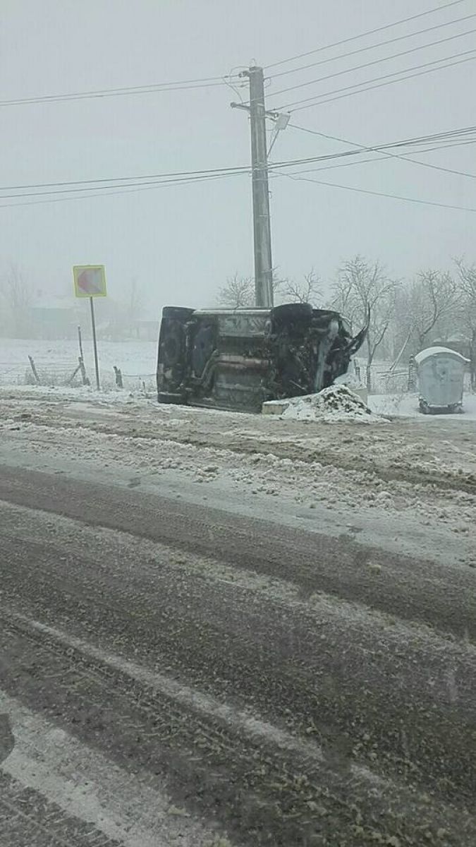Altă autoutilitară s-a răsturnat la Copălău, rămânând înfiptă într-un cap de pod. Din nou, conducătorul auto a declarat că a derapat pe zăpadă și nu a mai putut controla autovehicului.