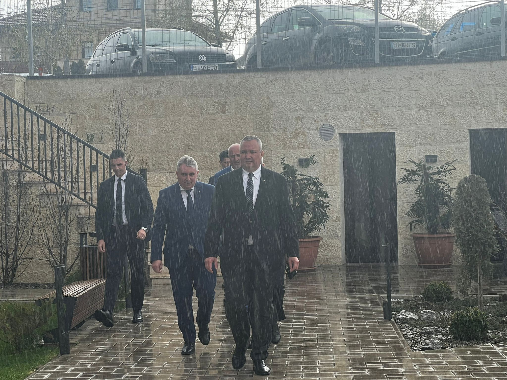 Președintele Senatului a sosit însoțit de Lucian Bode, secretarul general al PNL, chiar când municipiul Botoșani avea parte de un scurt episod de ploaie.