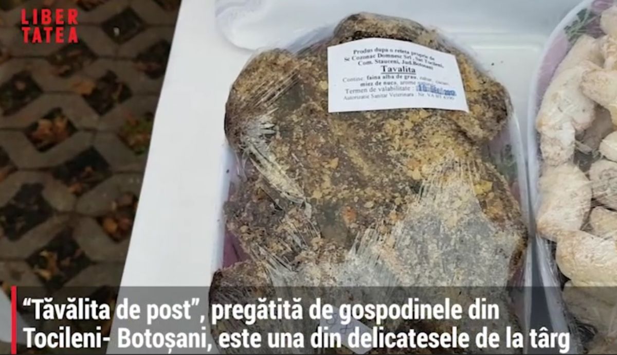 La Târgul cu bunătăți din pește și produse de post, deschis vineri, în Parcul IOR, bucătăresele din Moldova au adus dulciuri bune de te lingi pe degete. O prăjitură se numește ”tăvălita de Botoșani”.