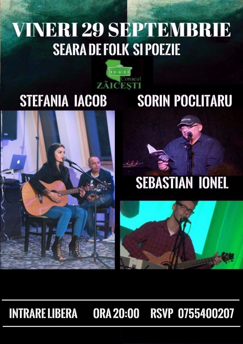 Vineri, de la ora 20:00, Conacul Zăiceşti invită botoșănenii care vor să asculte muzică folk şi poezie contemporană la o seară cu Ștefania Iacob, Sebastian Ionel și Sorin Poclitaru.
