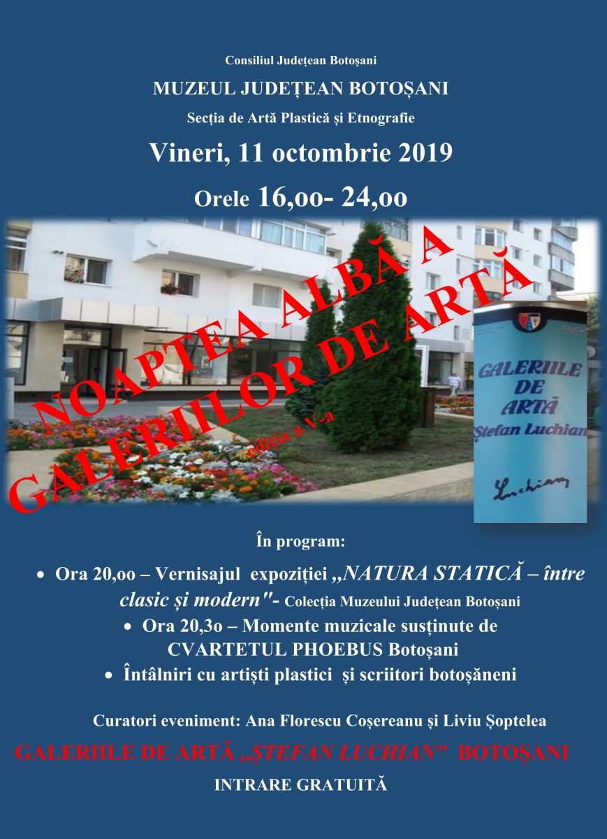 Muzeul Judeţean Botoşani organizează vineri, 11 octombrie 2019, în spaţiul Galeriilor de Artă ”Ştefan Luchian” Botoşani, evenimentul cultural ”Noaptea Albă a Galeriilor” - ediţia a V-a, între orele 16.00 – 24.00.