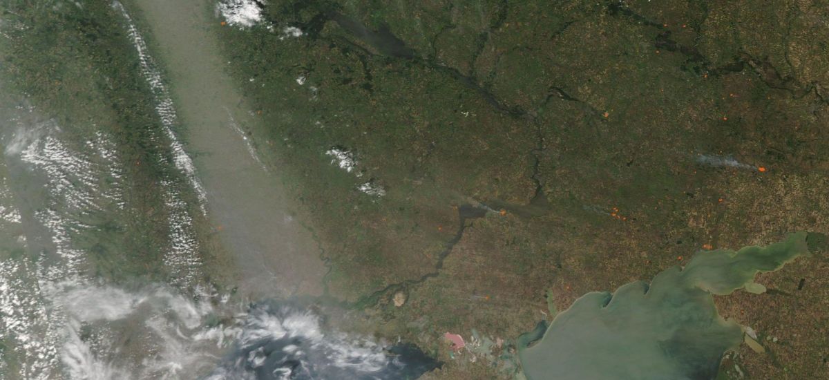 De altfel, pe imaginile satelitare detaliate se poate vedea cum la est de norul enorm de praf discutat mai sus există transport de fum din surse de incendiu la sol. Unul din punctele acestea este situat chiar în zona centralei nucleare de la Zaporojie, mult discutată în ultimul timp. Un alt incendiu major se manifesta în zona Donețk, iar un altul se găsește la mijlocul distanței dintre cele două. Pe imagine se poate vedea totuși că panașul de fum al acestor incendii se disipă la o distanță de câțiva zeci de km de sursă, fiind orientat de circulația atmosferică, spre vest. Spre deosebire de aceste surse punctuale, transportul de praf este unul cu extindere mult mai mare, ceea ce indică originea lui naturală (Conf. dr. Lucian Sfîcă).