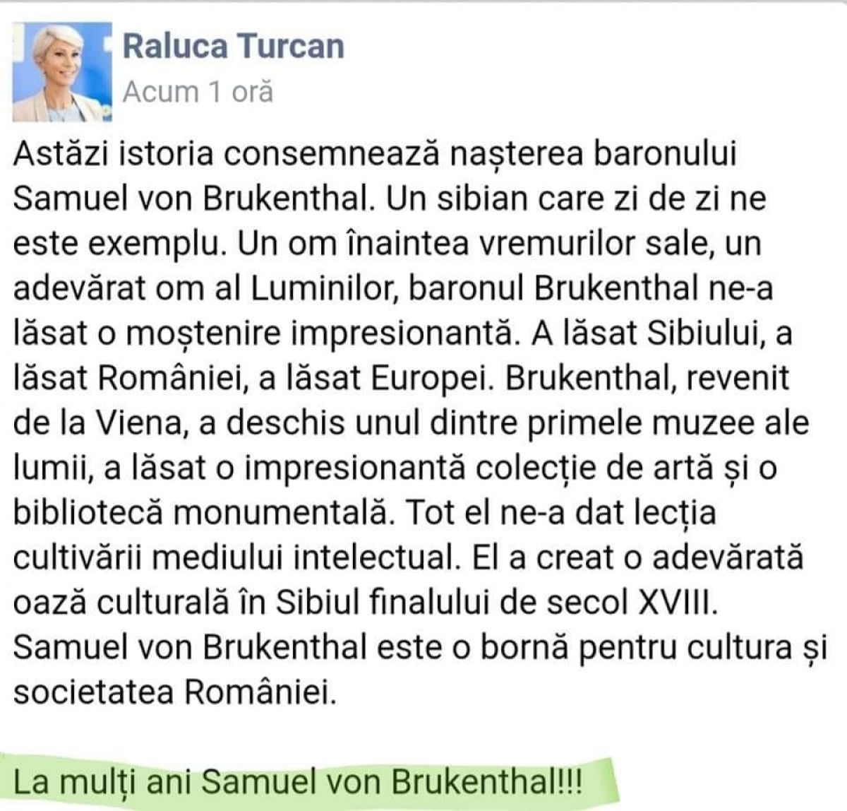 ”Astăzi istoria consemnează naşterea baronului Samuel von Brukenthal. Un sibian care zi de zi ne este exemplu. Un om înaintea vremurilor sale, un adevărat om al Luminilor, baronul Brukenthal ne-a lăsat o moştenire impresionantă. A lăsat Sibiului, a lăsat României, a lăsat Europei. Brukenthal, revenit de la Viena, a deschis unul dintre primele muzee ale lumii, a lăsat o impresionantă colecţie de artă şi o bibliotecă monumentală. Tot el ne-a dat lecţia cultivării mediului intelectual. El a creat o adevărată oază culturală în Sibiul finalului de secol XVIII. Samuel von Brukenthal este o bornă pentru cultura şi societatea României. La mulţi ani Samuel von Brukenthal!!!”,