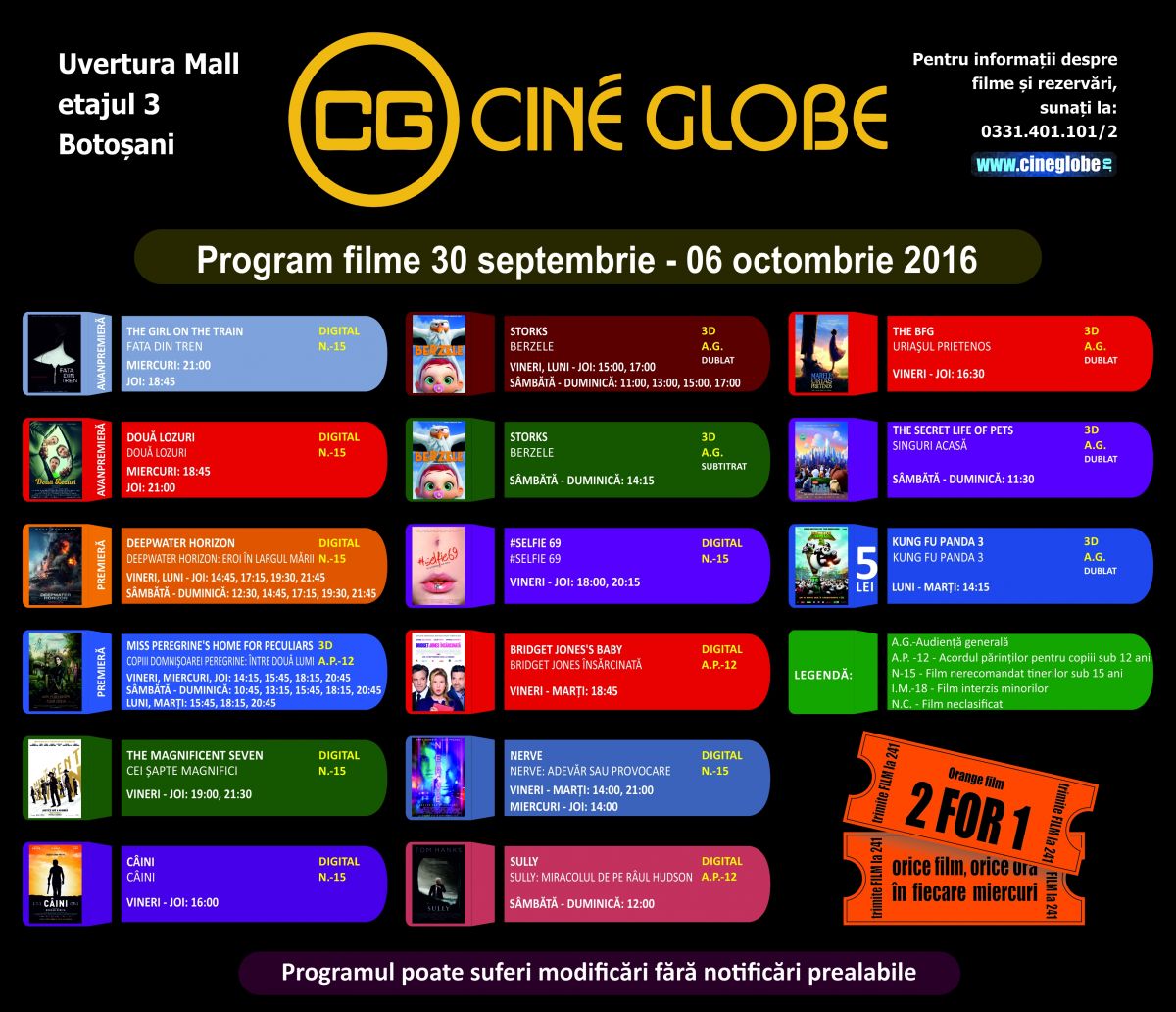 Reprezentanții Cine Globe au pregătit în perioada 30 septembrie - 6 octombrie 2016, două avanpremiere pe marile ecrane ale multiplexului din incinta Uvertura Mall.