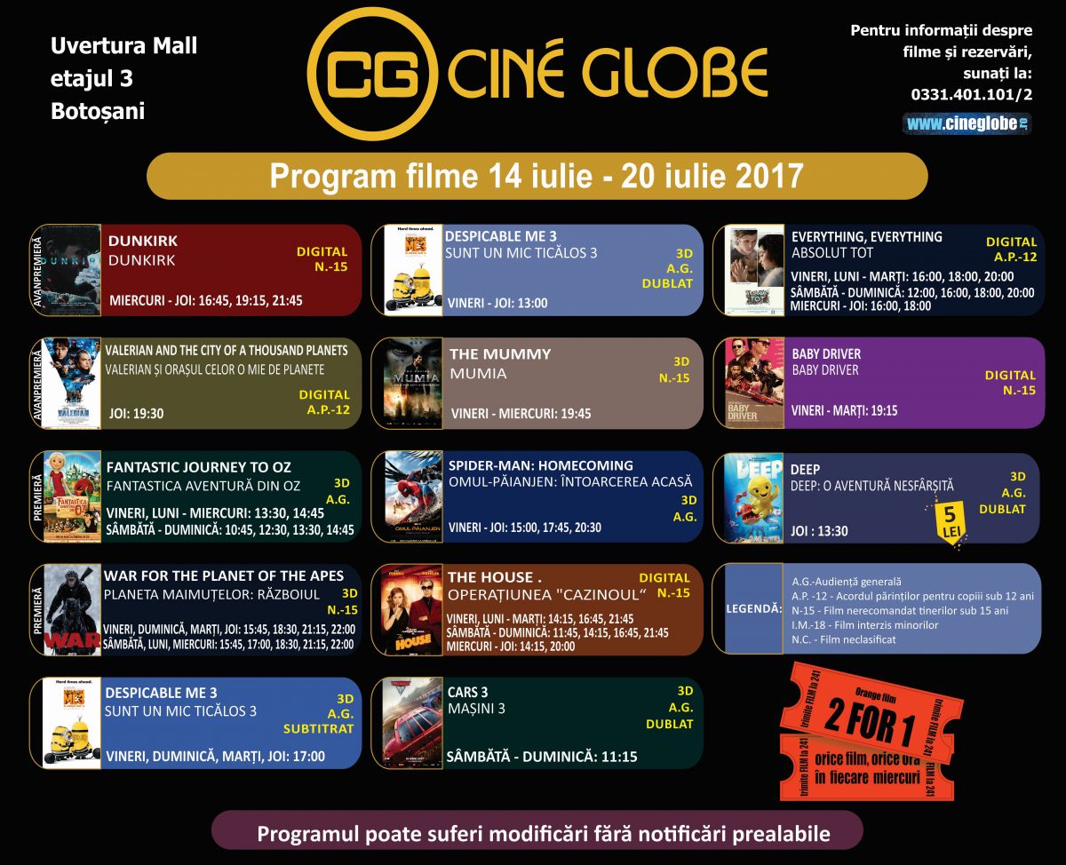 Botoșănenii iubitori de film se pot delecta în perioada 14 iulie – 20 iulie la Cine Globe, din incinta Uvertura Mall, cu noi pelicule pline de suspans şi aventură, care vor fi proiectate în avanpremieră.
