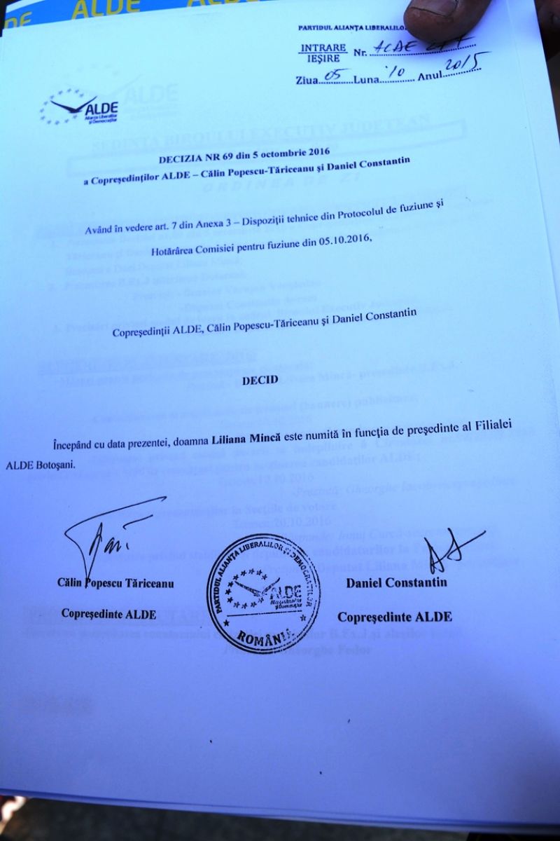 Parlamentara, care numai în ultimii patru ani a trecut pe la PP-DD, PND, UNPR și PSD, pentru ca în preajma alegerilor să ajungă la ALDE, aceasta după ce înainte de a devenit parlamentar a fost și membru PC, a venit cu o decize semnată de copreședinții partidului prin care este desemnată președinte ALDE Botoșani. Are numărul 69, este datată cu 5 octombrie 2016 și poartă semnăturile lui Daniel Constantin și Călin Popescu Tăriceanu.