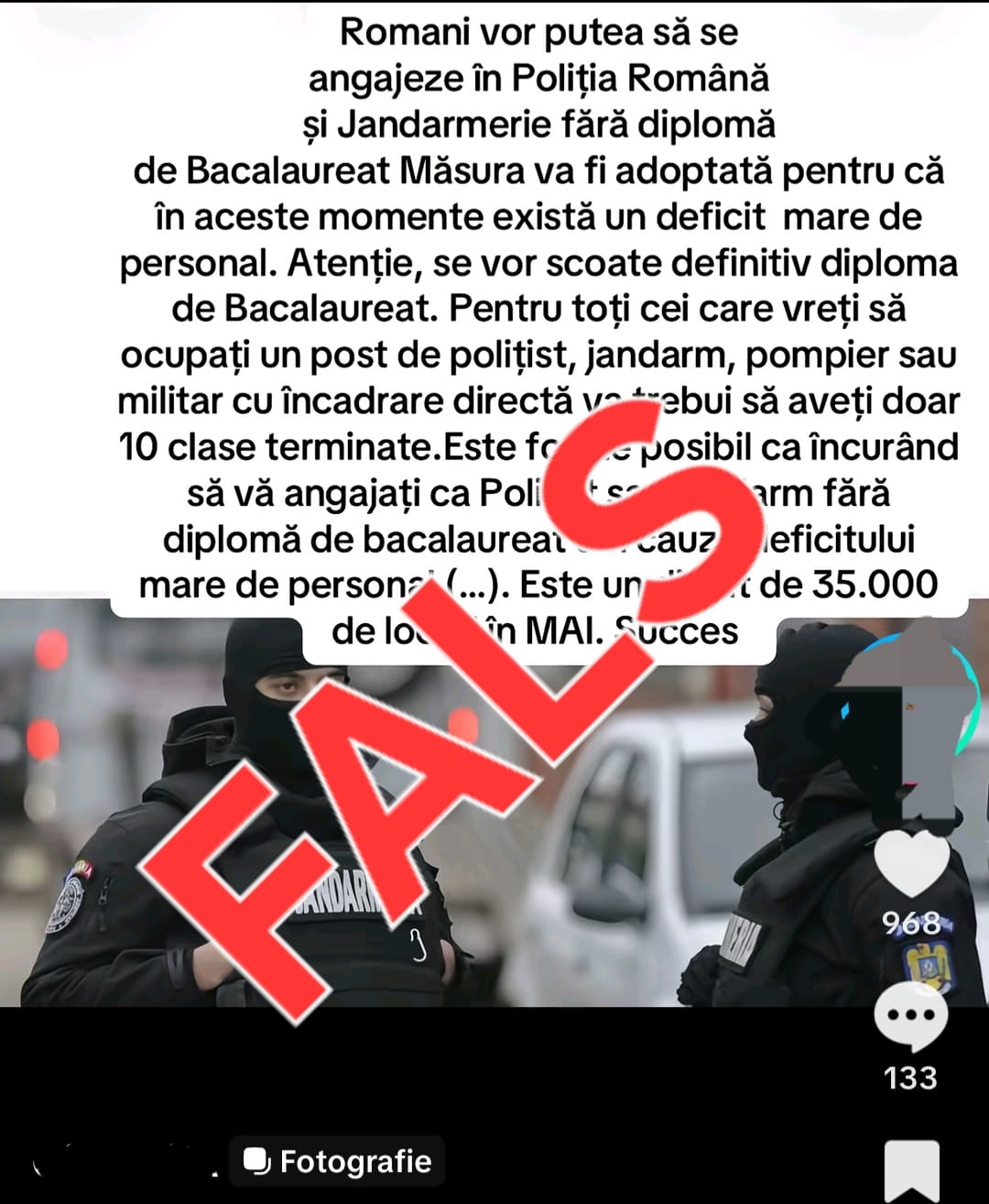 Este vorba despre existența unui proiect de lege prin care să poți ocupa un loc în MAI fără să ai diplomă de bacalaureat. Lucru total fals.