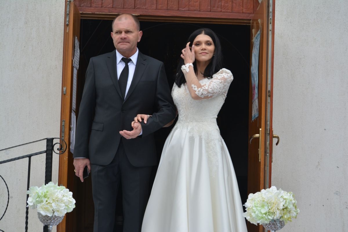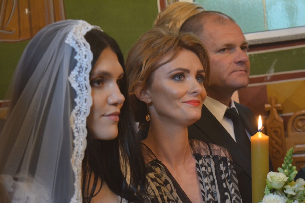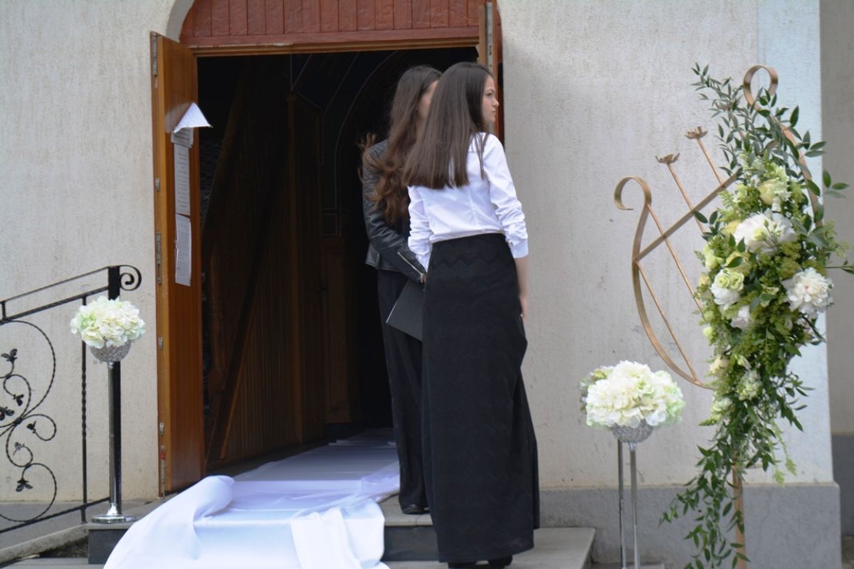 Katy a intrat la braț în lăcașul de cult alături de tatăl său, Cornel Șfaițer, în timp ce Alex a fost însoțit de mama sa.