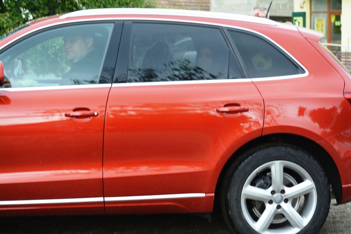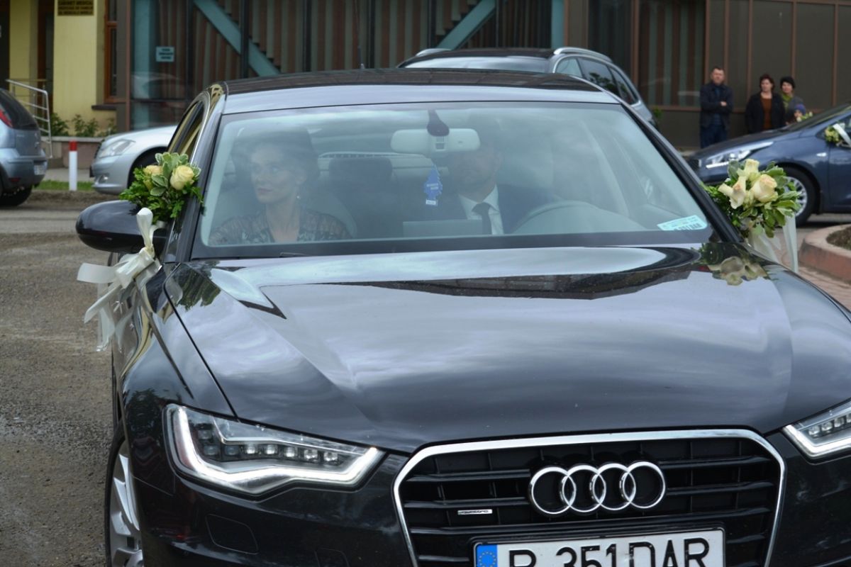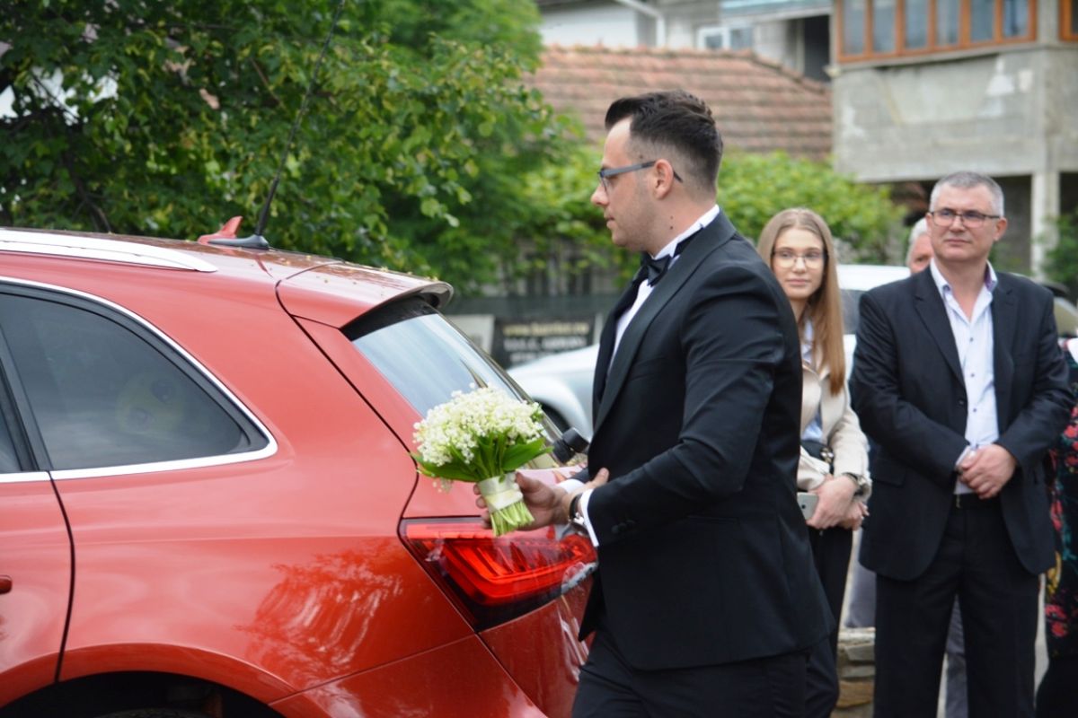 Alex și Katy, așa cum le spun prietenii și colegii, au sosit într-o mașină de teren. Întâi a coborât mirele, care cu un buchet de flori în mâini, a așteptat să coboare și mireasa, deschizându-i portiera.