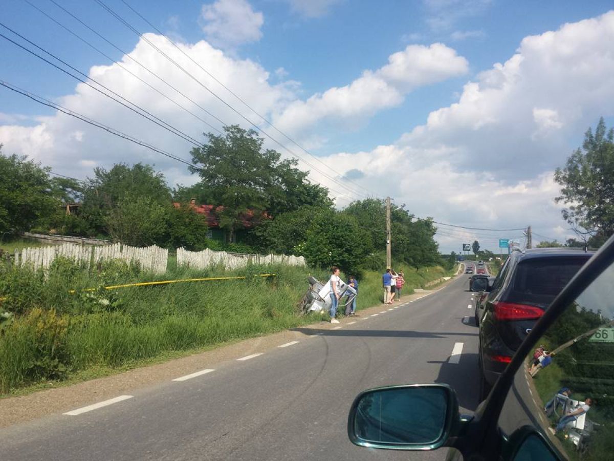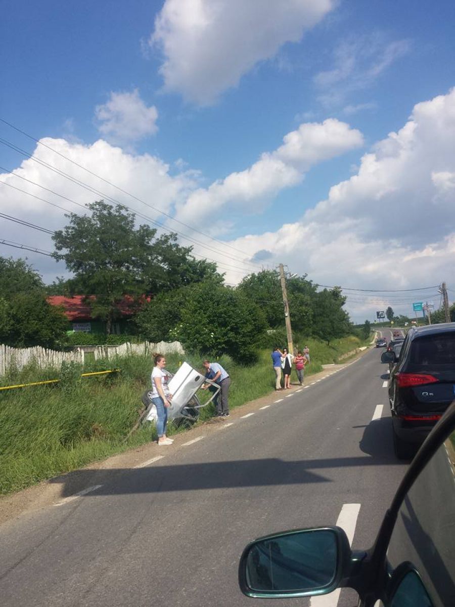 Derutată de conducătorul auto din faţă, conducătoarea auto a vrut să revină pe sensul normal de mers, însă probabil că a tras prea tare dreapta de volan şi a ajuns în şanţ.