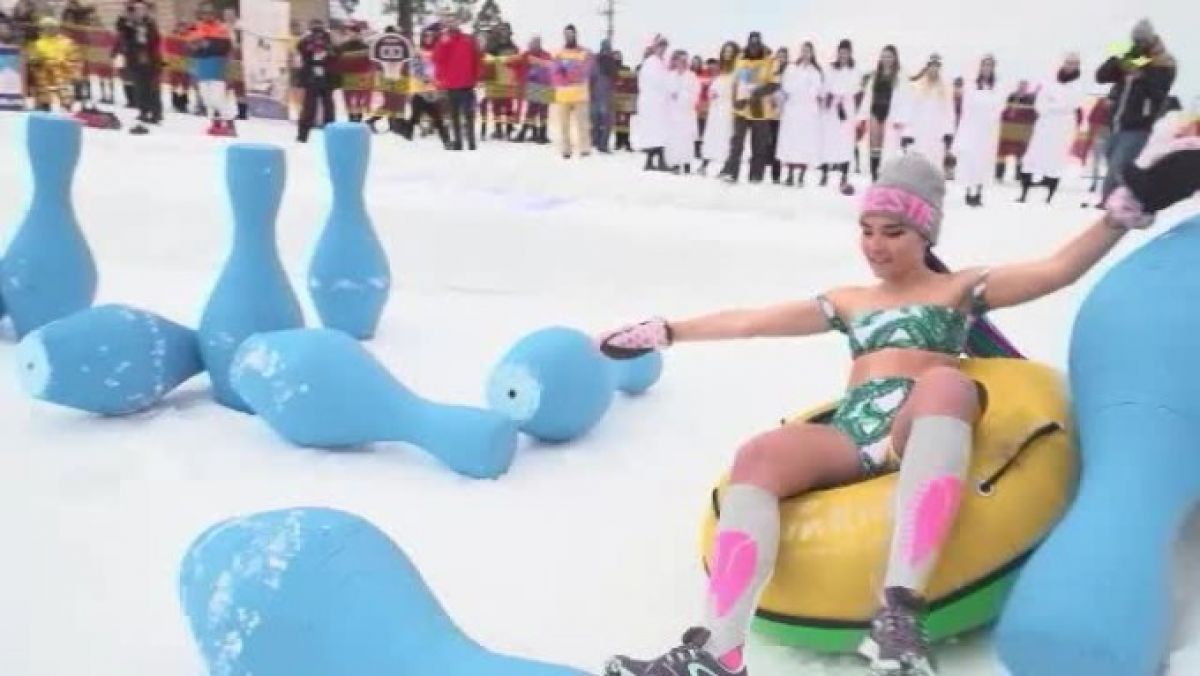 Cele 14 concurente au trecut cu brio proba pe schiuri sau pe snowboard, apoi au fost provocate să arunce la un coş de baschet şi să treacă pe sub o bară de dans.
