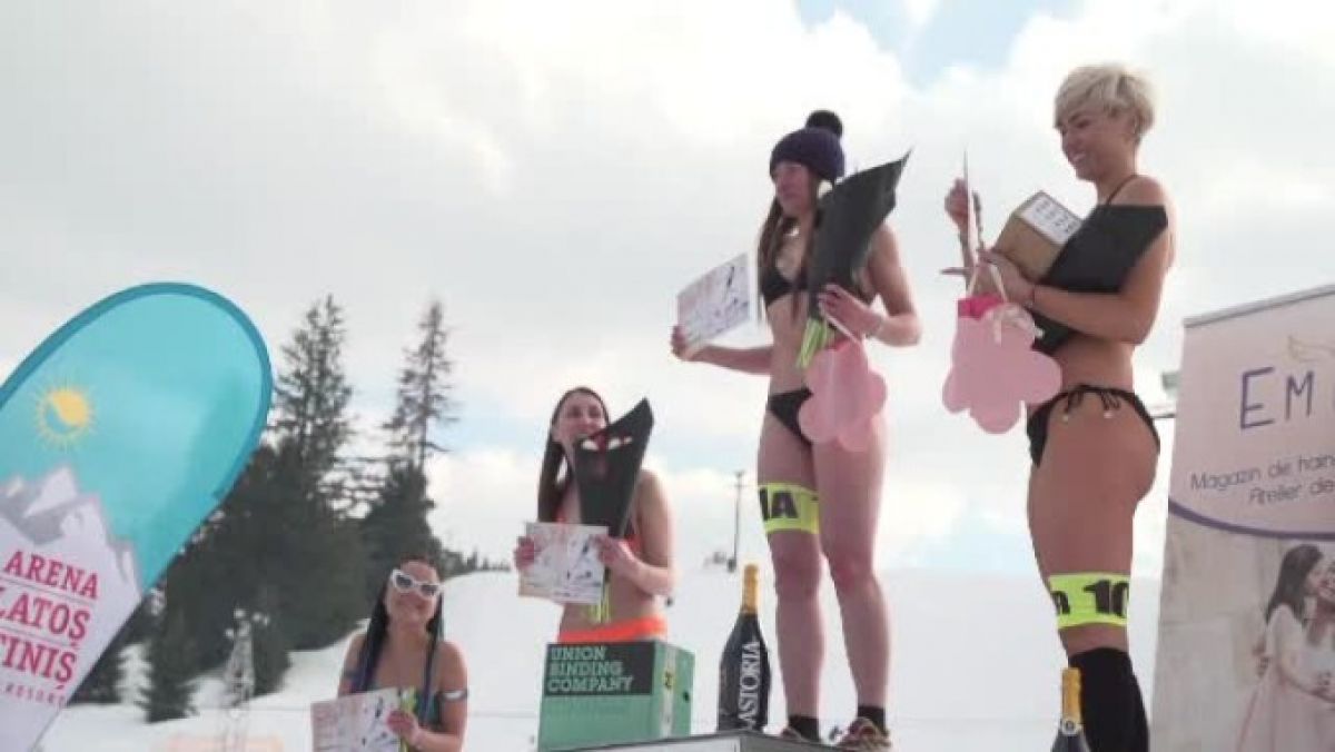 14 tinere curajoase s-au întrecut duminică pe pârtia din Păltiniș, pentru titlul de Miss Bikini. Deşi soarele a fost cam scump la vedere, fetele au defilat doar în costum de baie.