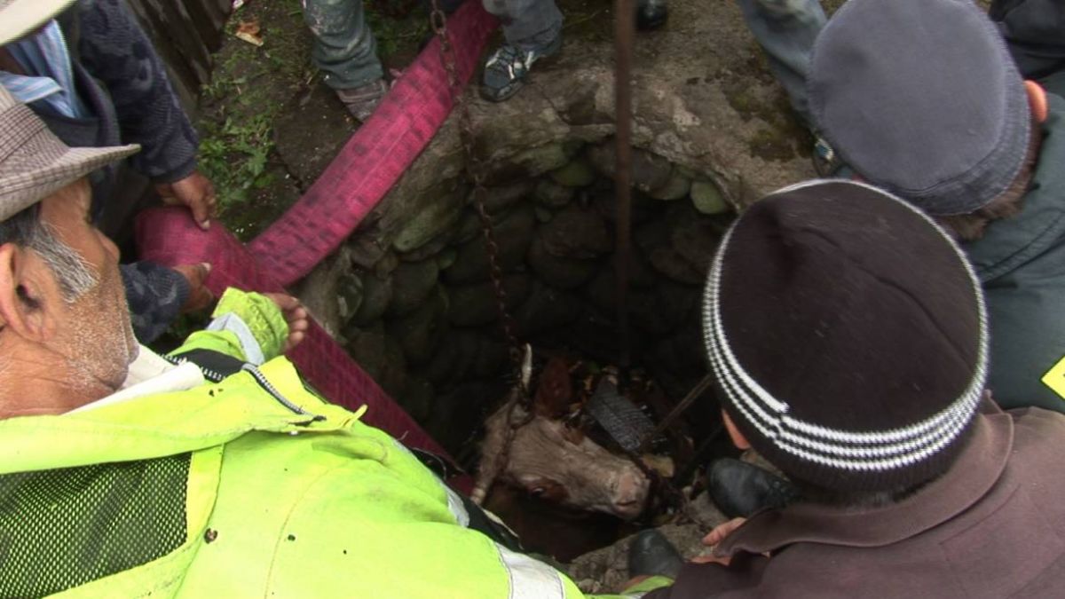 S-a întâmplat astăzi, la prânz. Bovina, ce cântărea aproximativ 400 de kg, a intrat cu picioarele din spate în fântâna construită la nivelul solului şi care nu era acoperită.
