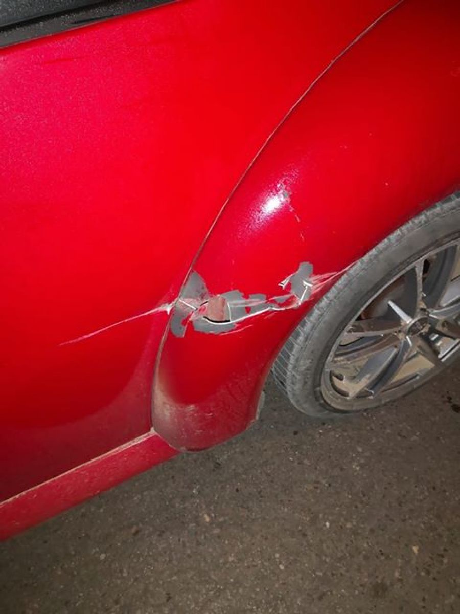 A prins un capac de canal care i-a tăiat unul dintre cauciuri și care mai apoi a ricoșat în caroserie.