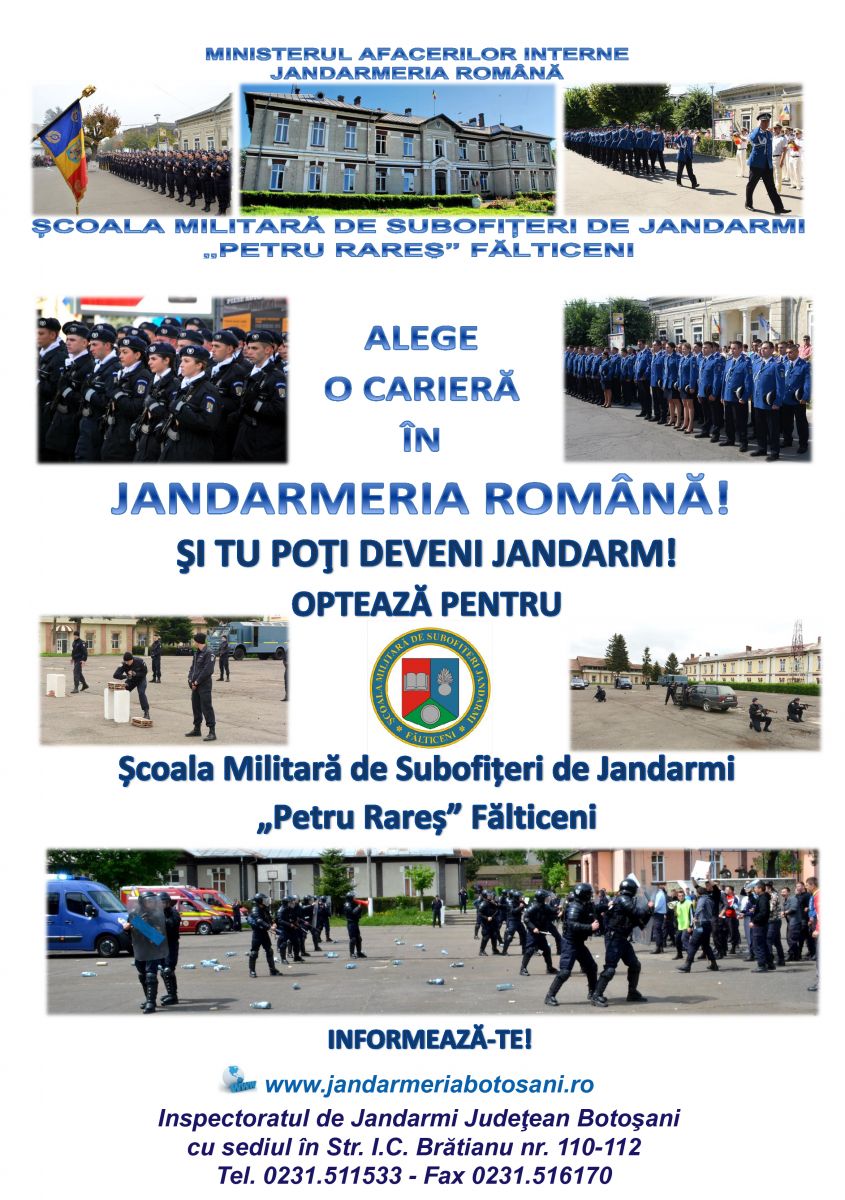 În ziua de miercuri, 15 noiembrie 2017, în intervalul orar 14.30 - 17.00 o caravană a Jandarmeriei Române va fi prezentă în judeţul Botoşani.