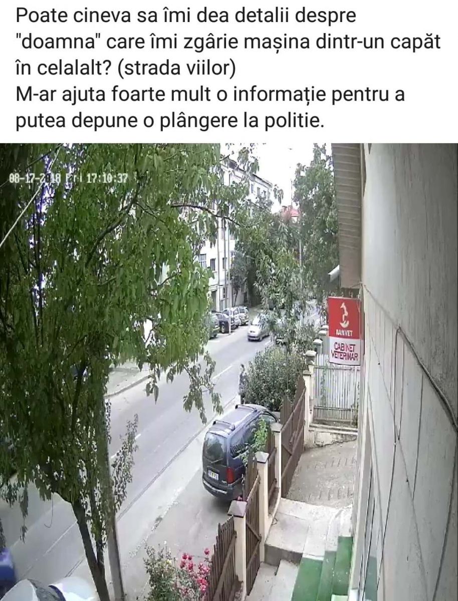 „Poate cineva să îmi dea detalii despre „doamna” care îmi zgârie mașina dintr-un capăt în celălalt? M-ar ajuta foarte mult o informație pentru a putea depune plângere la Poliție”,