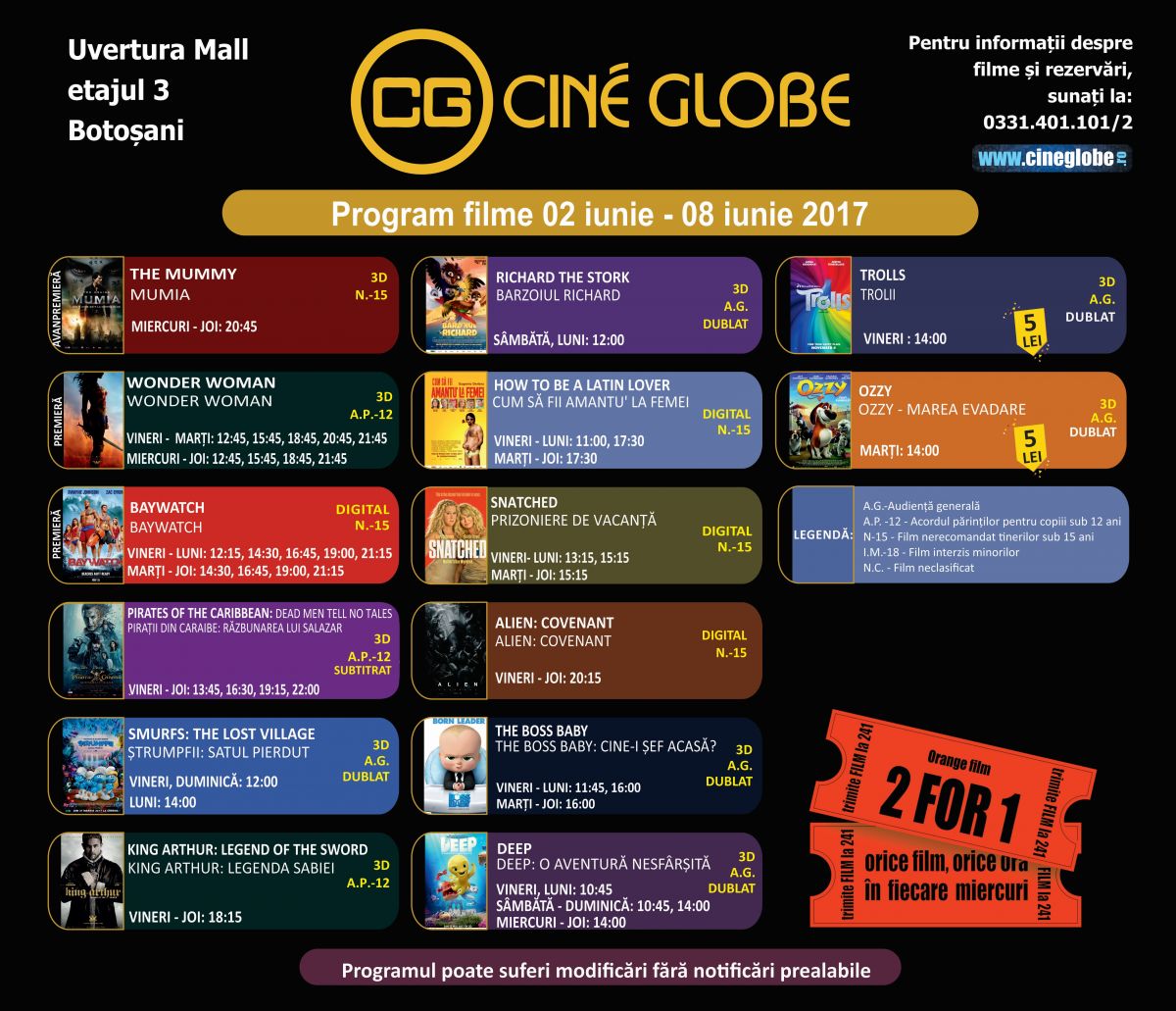 Botoșănenii iubitori de film se pot delecta în perioada 2 iunie – 8 iunie la Cine Globe, din incinta Uvertura Mall, cu noi pelicule pline de aventură, care vor fi proiectate în avanpremieră.