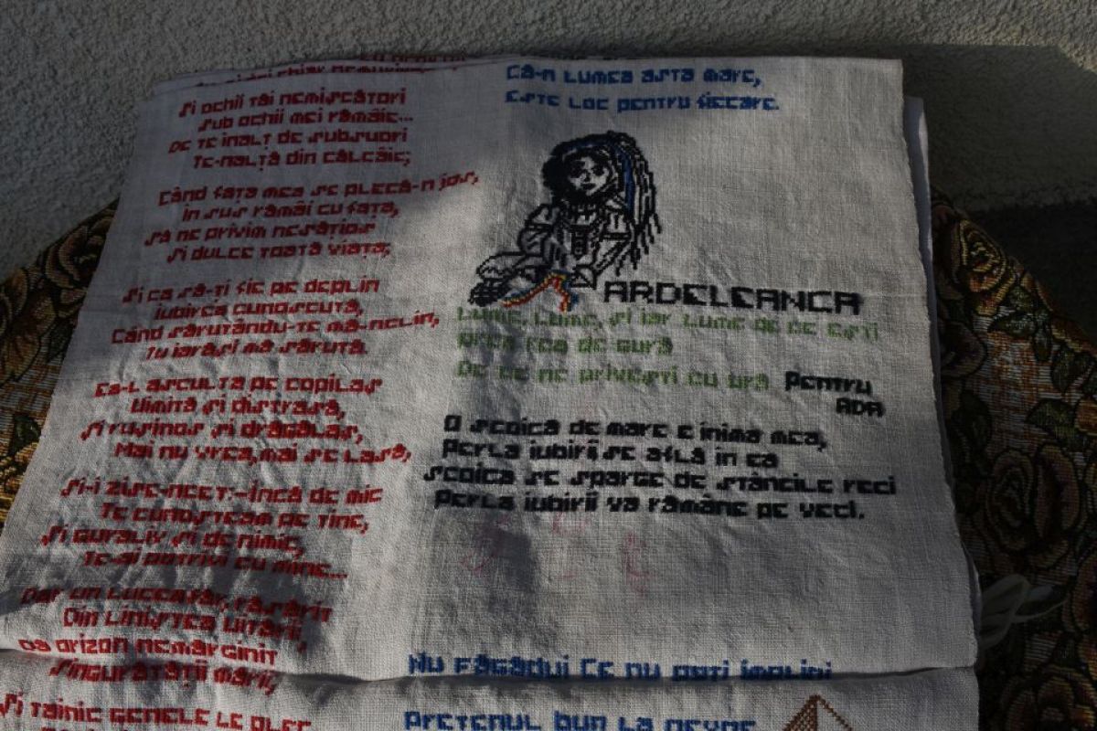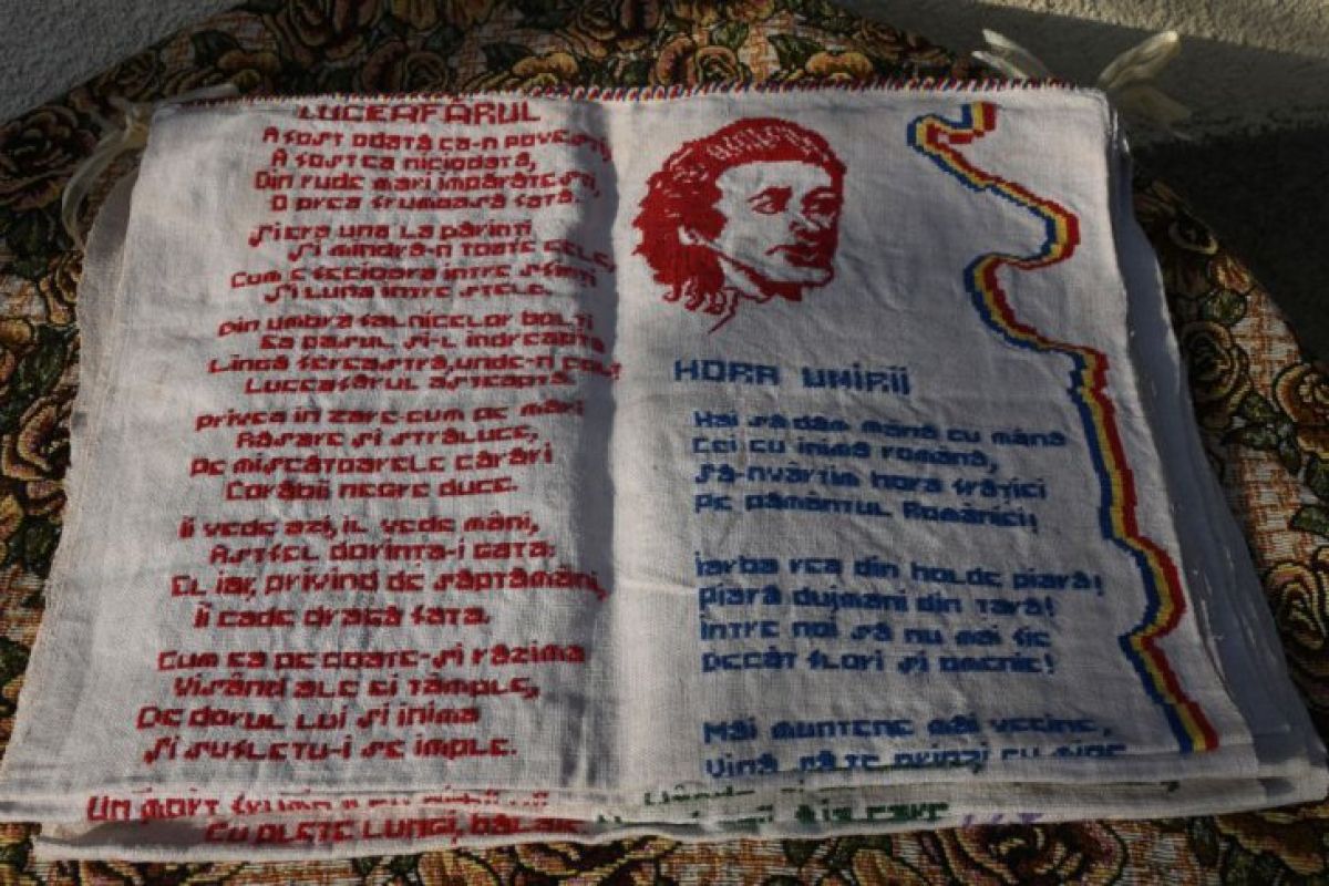 ,,Mi-am amintit de pânza de cânepă pe care bunica mi-a lăsat-o să fac din ea saci și am hotărât să folosesc câțiva metri din acest material pentru a da viață unei părți din creația poetului nepereche Mihai Eminescu. Un lucru deloc ușor, care mi-a luat ani de muncă. A trebuit să calculez matematic locul ce se cuvine pentru fiecare strofă, pentru fiecare rând sau literă”.