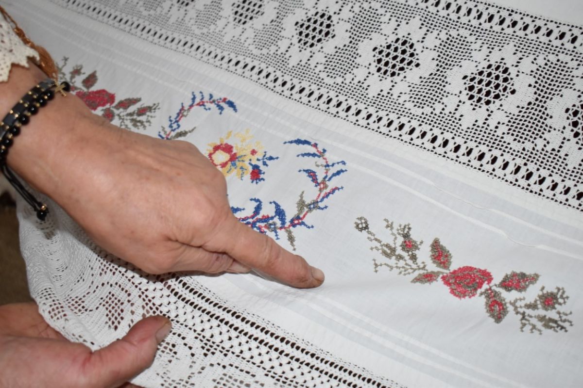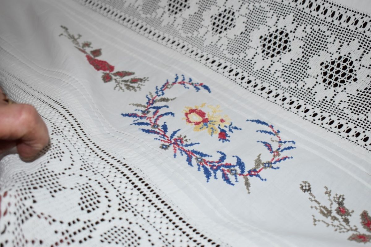 A arătat o față de masă croșetată manual care în perioada comunistă a fost premiată la concursul „Cântarea României” și care a fost salvată de trecerea timpului.