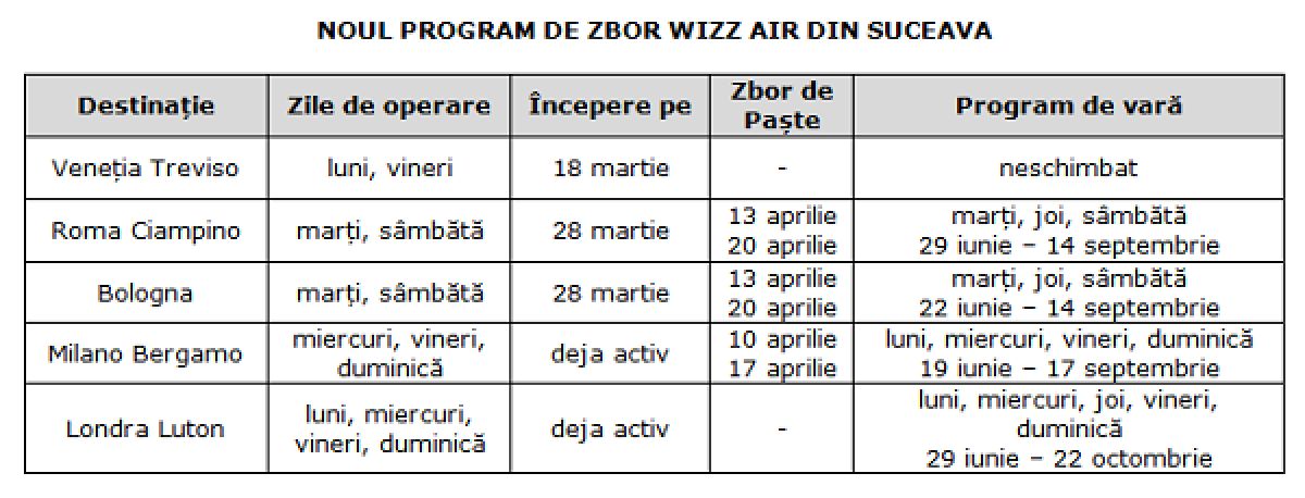 Cele trei rute sunt spre Treviso, Bologna si Roma Ciampino, in Italia . De asemenea Wizz Air mareste frecventa zborurilor catre Italia si Marea Britanie in timpul sezonului estival, precum si in timpul sarbatorilor pascale, a anuntat operatorul.