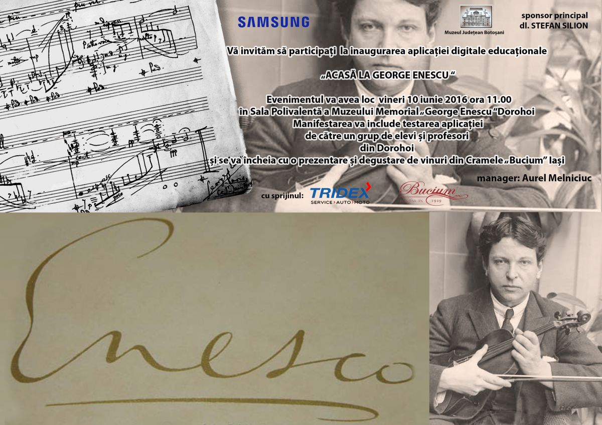 Aplicația „Acasă la Enescu”, disponibilă în Galaxy Apps și Googple Play, se adresează în special copiilor cu vârste între 7 și 14 ani, fiind un mod interactiv și amuzant de învățare, însă poate fi accesată de orice pasionat de muzică ce vrea să afle mai multe despre George Enescu. Vizitatorii sunt astfel invitați să descopere operele lui George Enescu și informații despre viața acestuia prin intermediul aplicației „Acasă la Enescu”. Mai mult, aceștia își pot testa cunoștințele muzicale prin intermediul tehnologiei și pot recrea operele acestuia pe portativul aplicației. În cadrul proiectului, Muzeul Memorial „George Enescu” va fi dotat cu 6 tablete și un eBoard Samsung care vor schimba modul de interacțiune a vizitatorilor cu exponatele și vor aduce un nou mod de vizitare. Proiectul face parte din inițiativele CSR ale companiei și continuă eforturile de digitalizare și promovare a valorilor românești demarate prin parteneriatul cu Muzeul Județean Botoșani. Lansarea proiectului va avea loc vineri, 10 iunie 2016, ora 1100, în Sala Polivalentă a Muzeului Memorial „George Enescu” din Dorohoi. Persoanele interesate să participe la manifestare vor avea la dispoziţie un microbuz care va pleca spre Dorohoi din faţa Muzeului Judeţean Botoşani la ora 9,50.