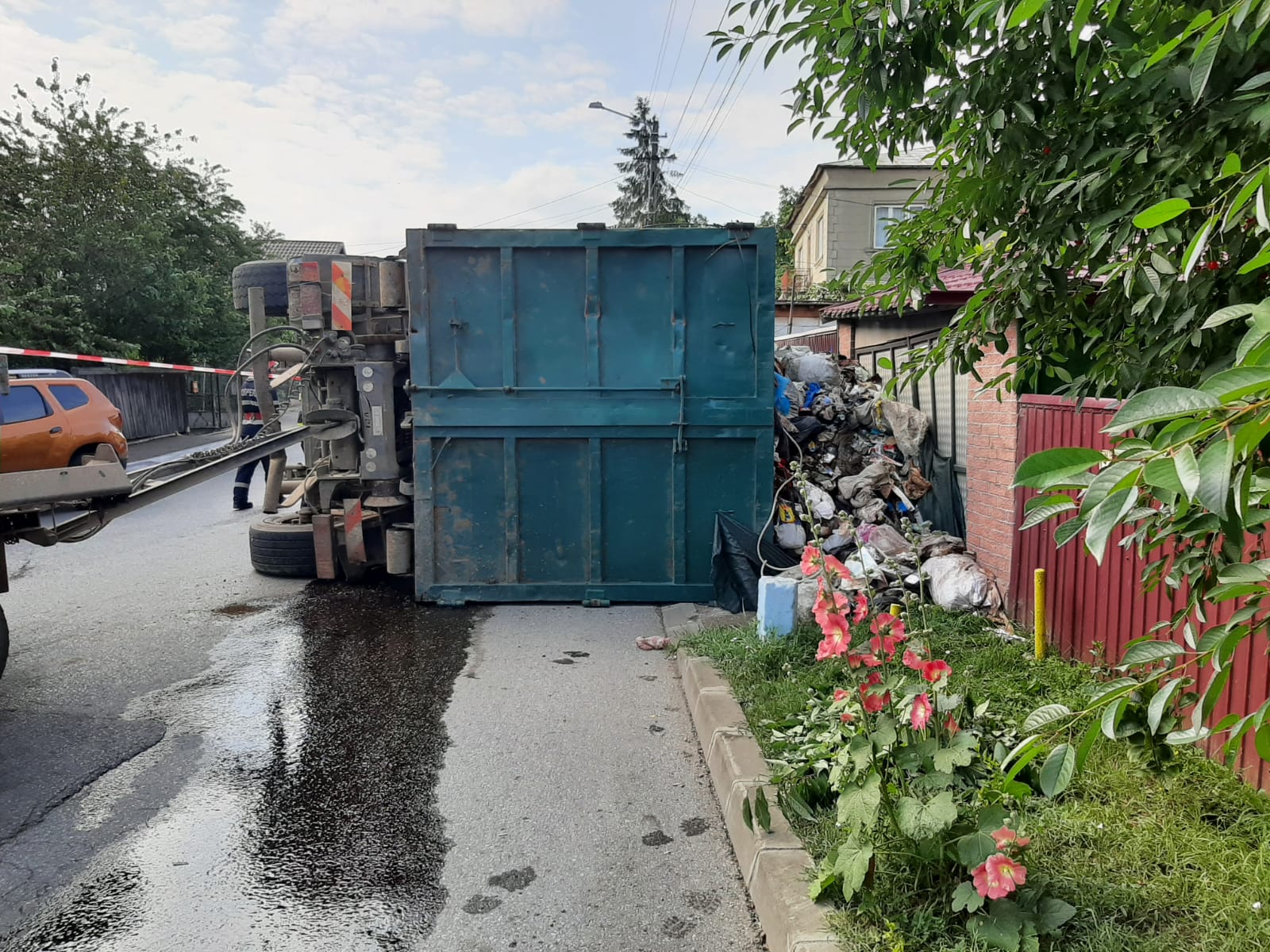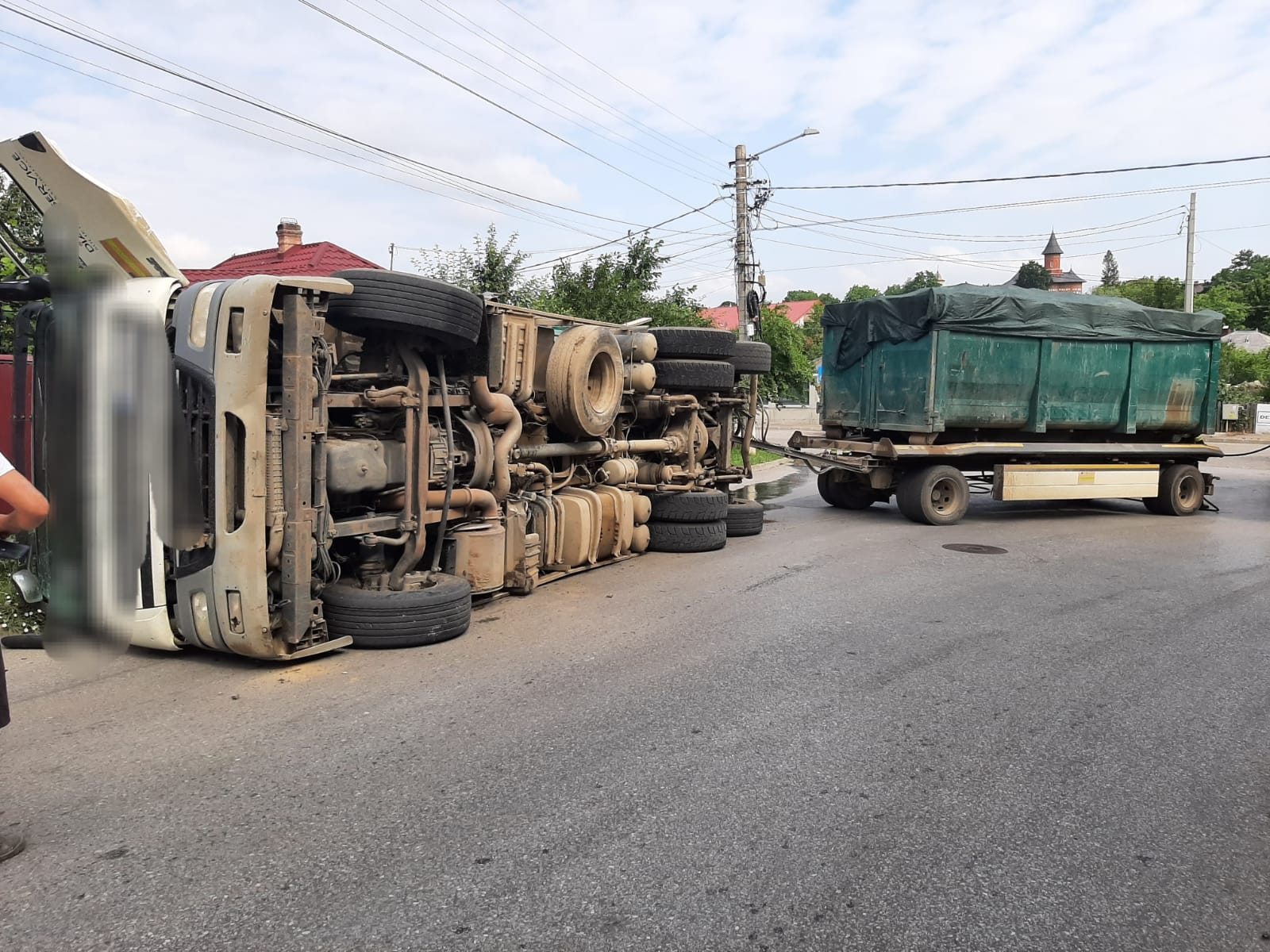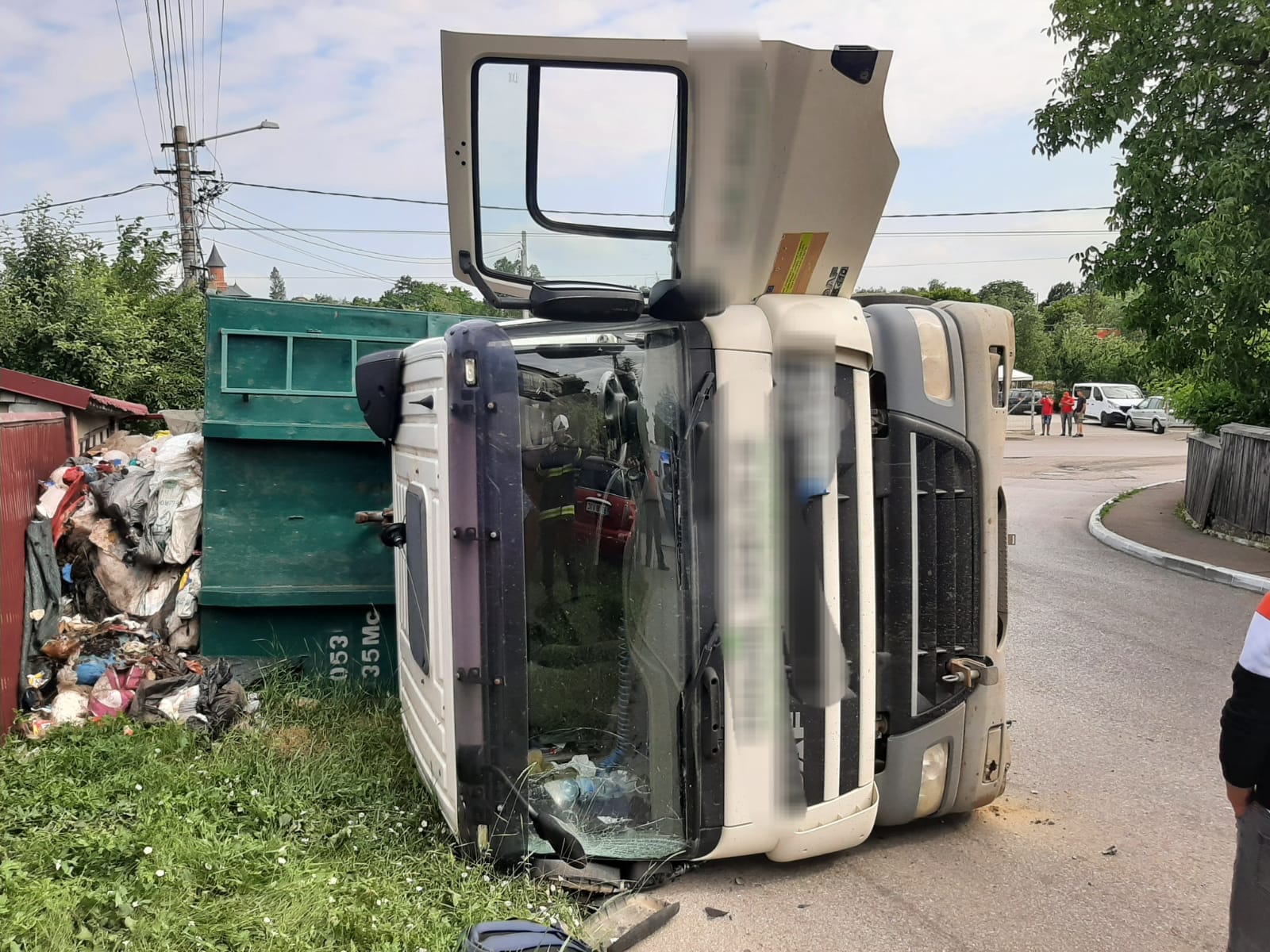 O mașină cu gunoi s-a răsturnat pe o stradă, șoferul a fost rănit