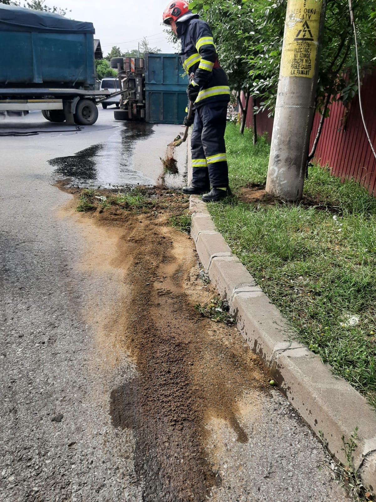 Pompierii au asigurat măsurile de prevenire a incendiilor și au acționat pentru sablarea părții carosabile, dar și pentru deconectarea bornelor de la bateria ansamblului rutier.