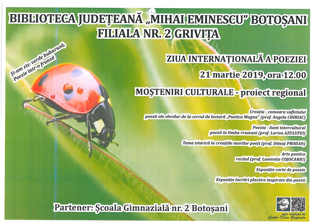 În aceeași zi, la ora 12, la Filiala numărul 2 Grivița a Bibliotecii Județene ,,Mihai Eminescu” va avea loc activitatea ,,Și-am zis verde, buburuză, poezie într-o frunză” dedicată Zilei Internaționale a Poeziei.
