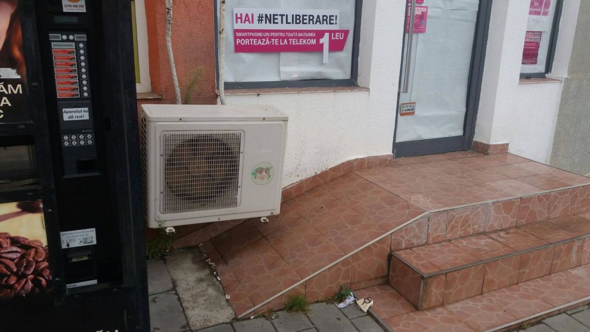 O dată de un aparat de aer condiționat ce a fost montat la distanță mică de la sol și încă o dată de un aparat de cafea.