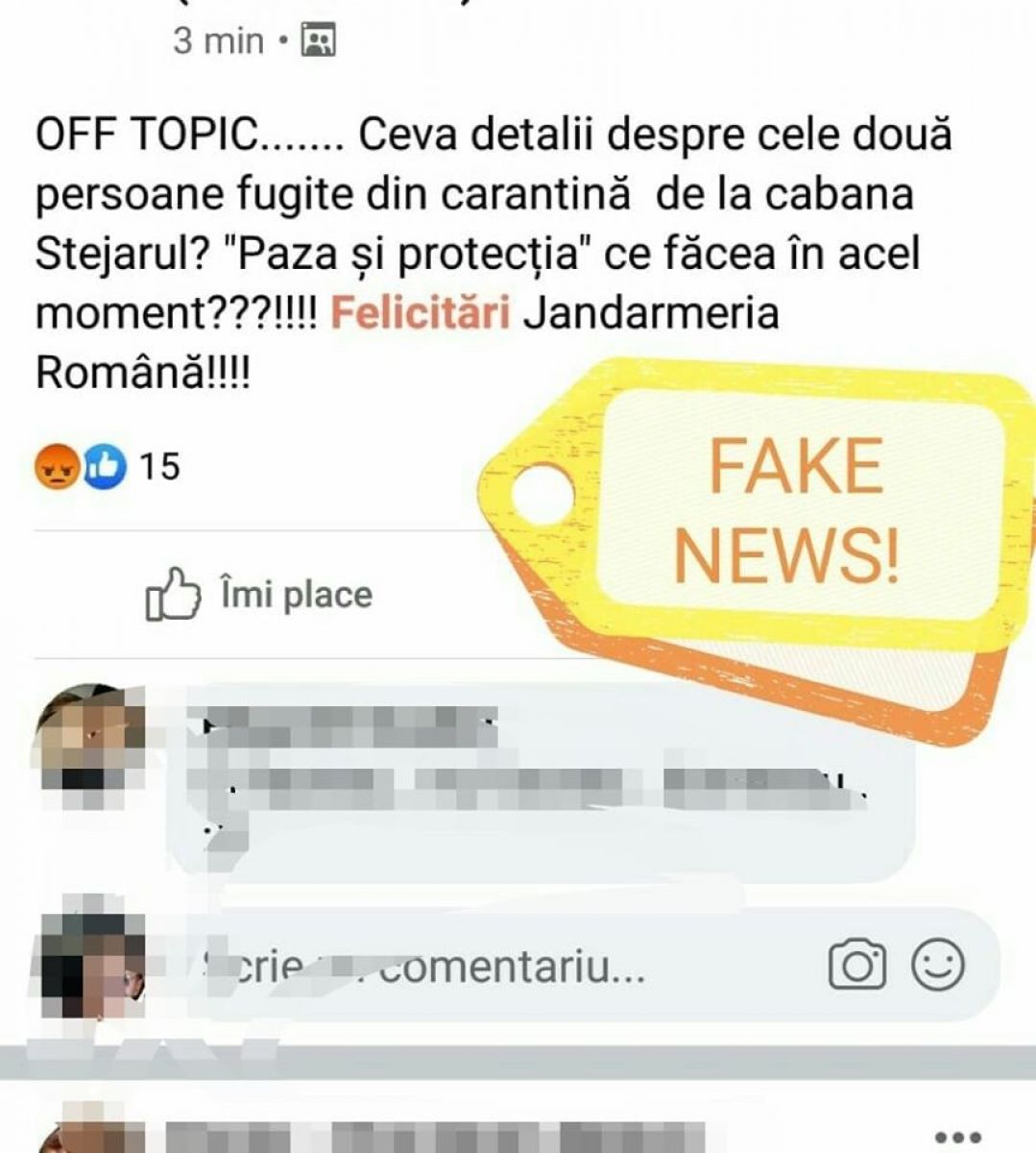 „Referitor la postarea făcută pe o pagină de Facebook, în care se afirma că două persoane cazate într-un centru de carantină din județul Botoșani au plecat fără ca jandarmul aflat în serviciu să observe, facem următoarele precizări: Nicio persoană aflată în cele trei centre de carantină din județul Botoșani nu a părăsit aceste locații”,