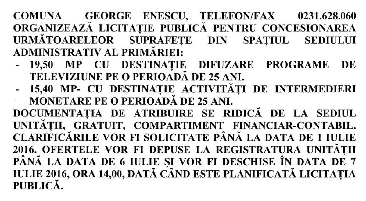 Primăria George Enescu a scos la licitație 19,50 metri pătrați din clădirea în care își desfășoară activitatea pentru ”difuzare de programe de televiziune pe o perioadă de 25 de ani”. Licitația este programată pe data de 7 iulie, însă cei interesați trebuie să depună ofertele cel târziu cu o zi înainte.