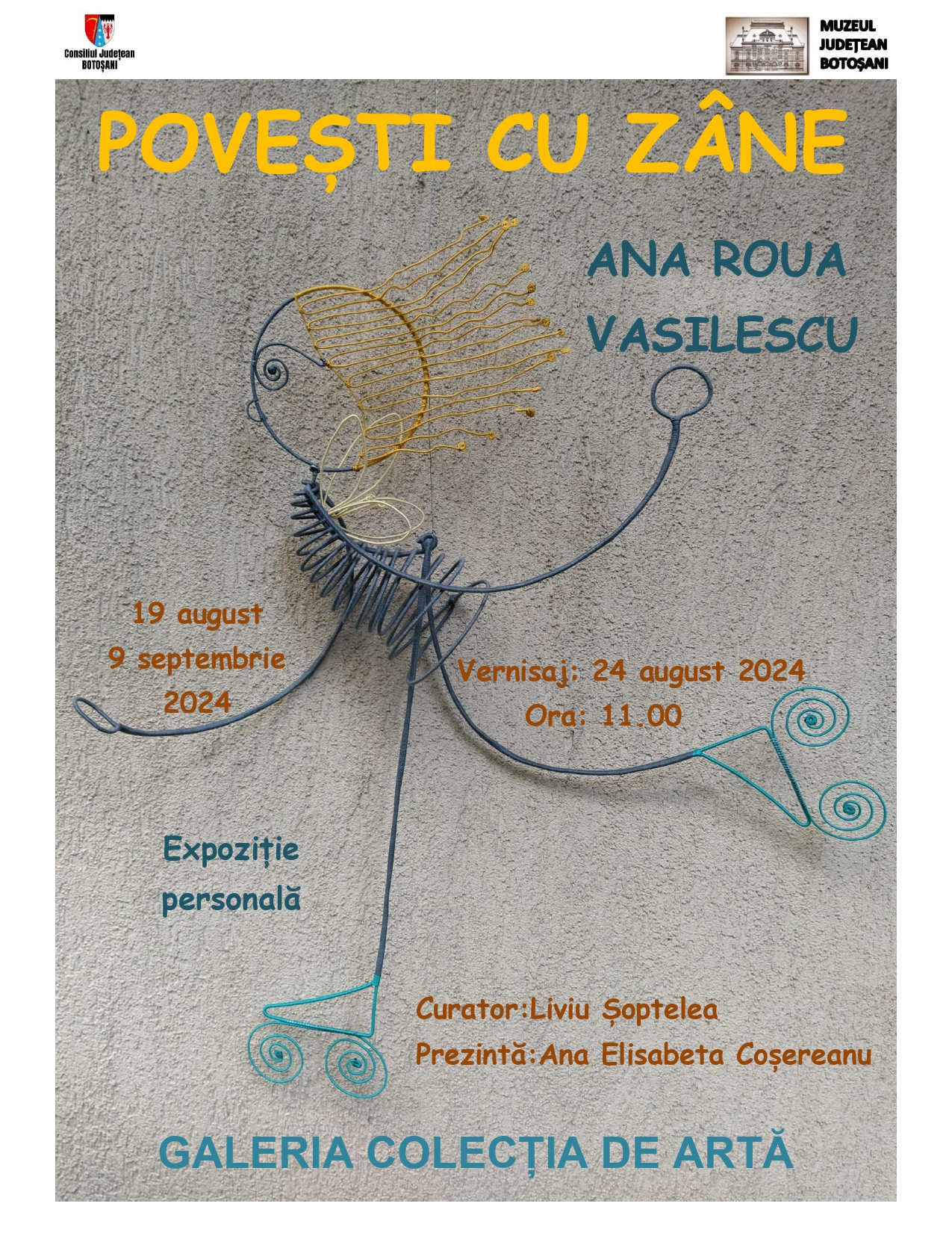 Muzeul Județean Botoșani găzduiește, în perioada 19 august – 9 septembrie 2024, în spațiul Colecției de Artă, expoziția „Povești cu zâne” a artistei Ana Roua Vasilescu