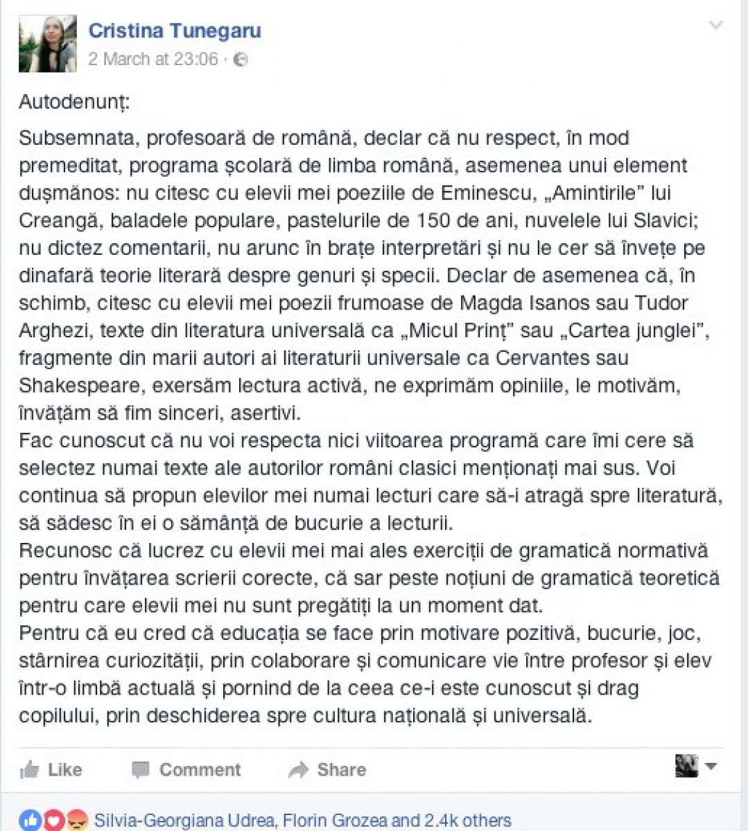 O profesoara de limba romana postat pe facebook un autodenunt. Pe scurt, nu mai vrea sa predea in scoala poezii de Eminescu, Amintirile lui Creanga si Slavici…