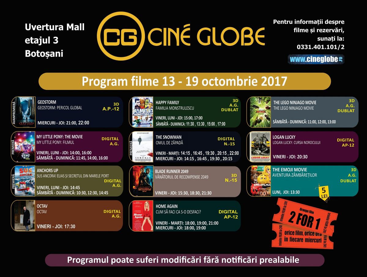 Astfel cinefilii botoşăneni pot vedea în avanpremieră filmul Geostorm (Geostorm: Pericol Global) în regia lui Dean Devlin cu actorii Jeremy Ray Taylor, Gerard Butler, Abbie Cornish, Talitha Bateman, Ed Harris.
