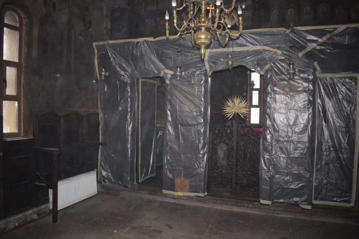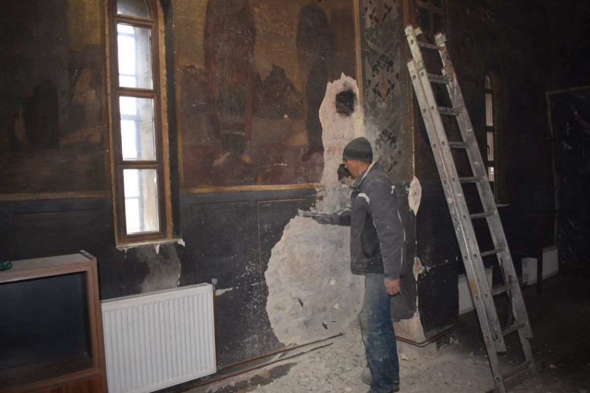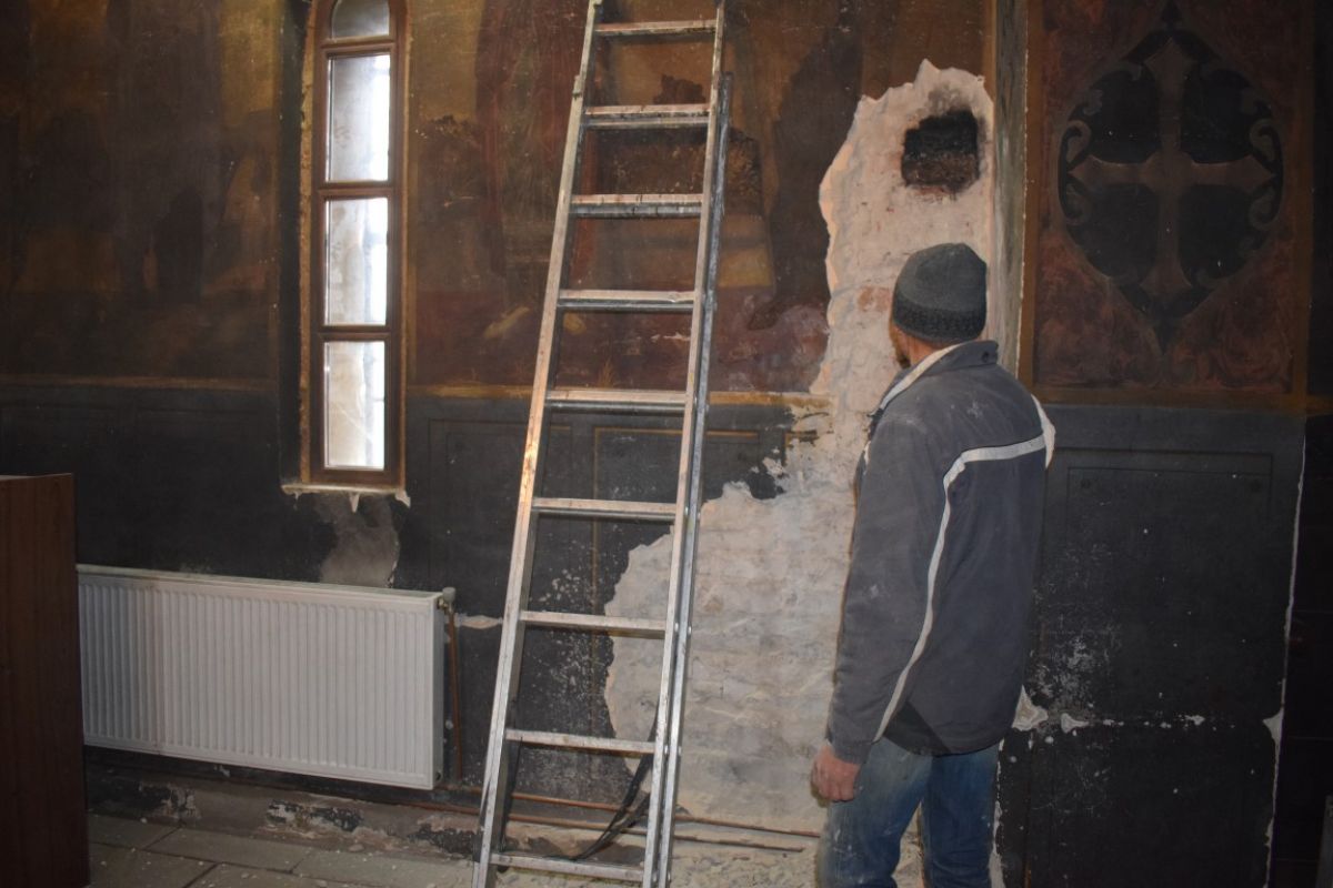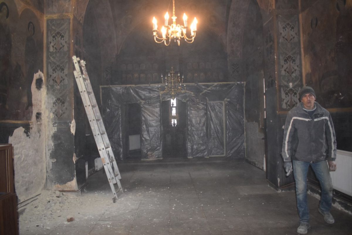 De altfel, ieri un muncitor cu un ciocan începuse să înlăture picturile de pe pereții Bisericii, până la tencuială.