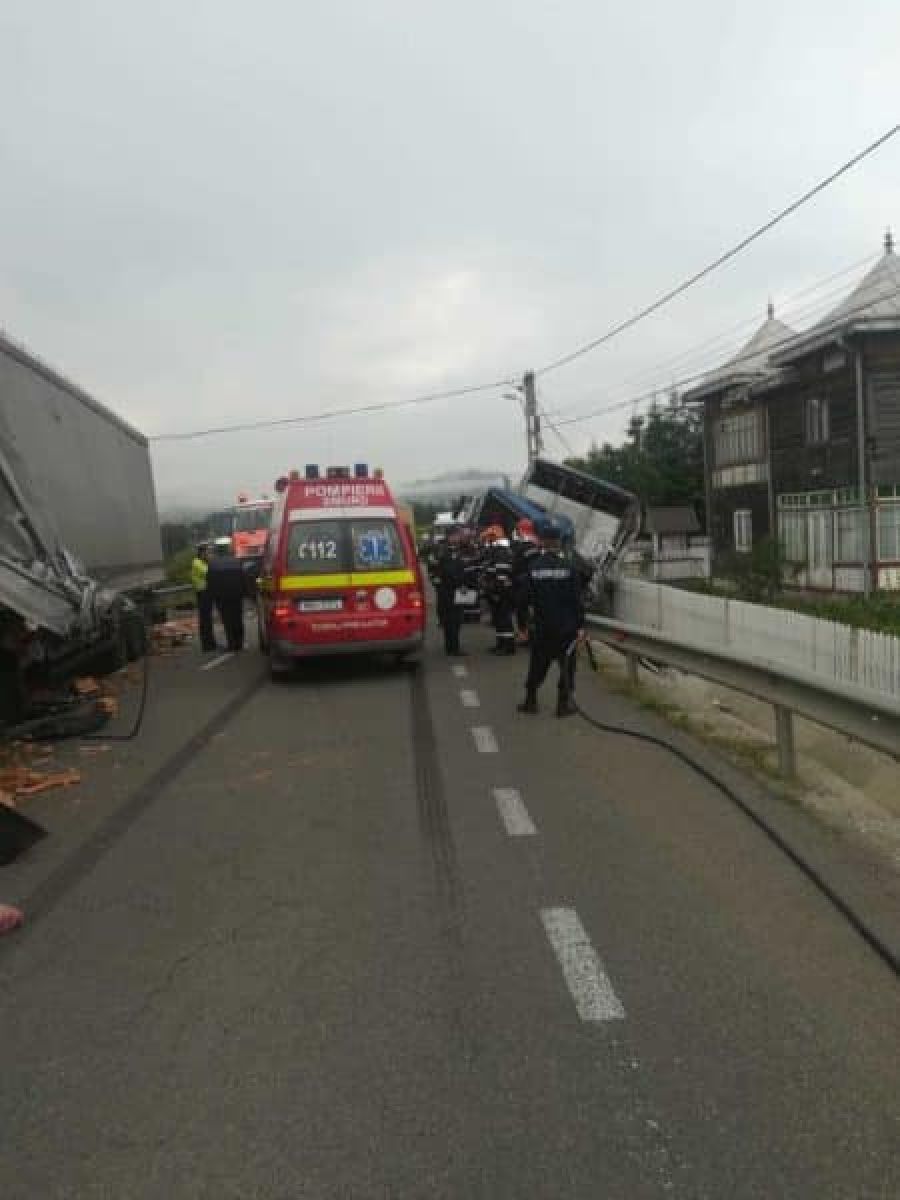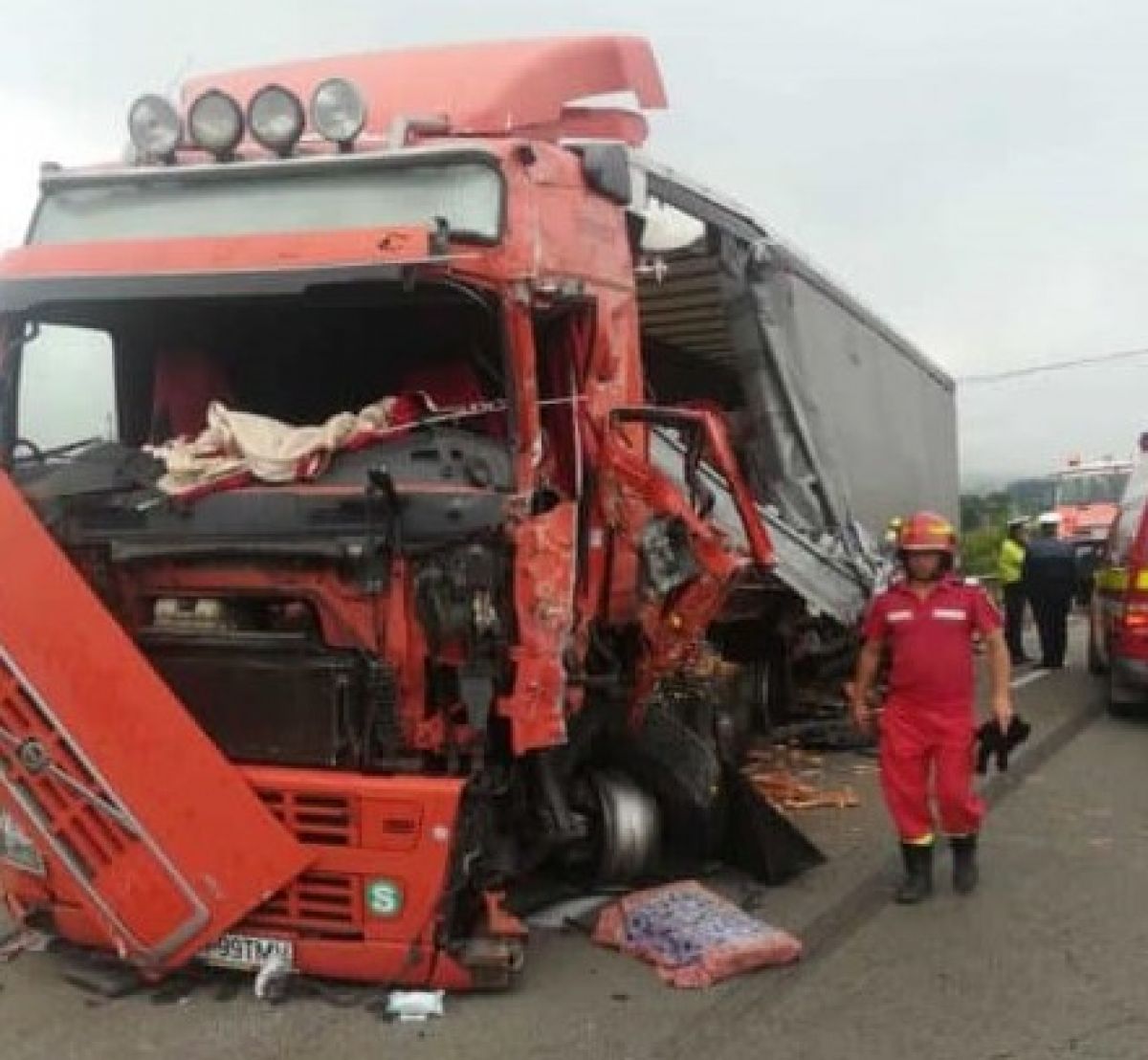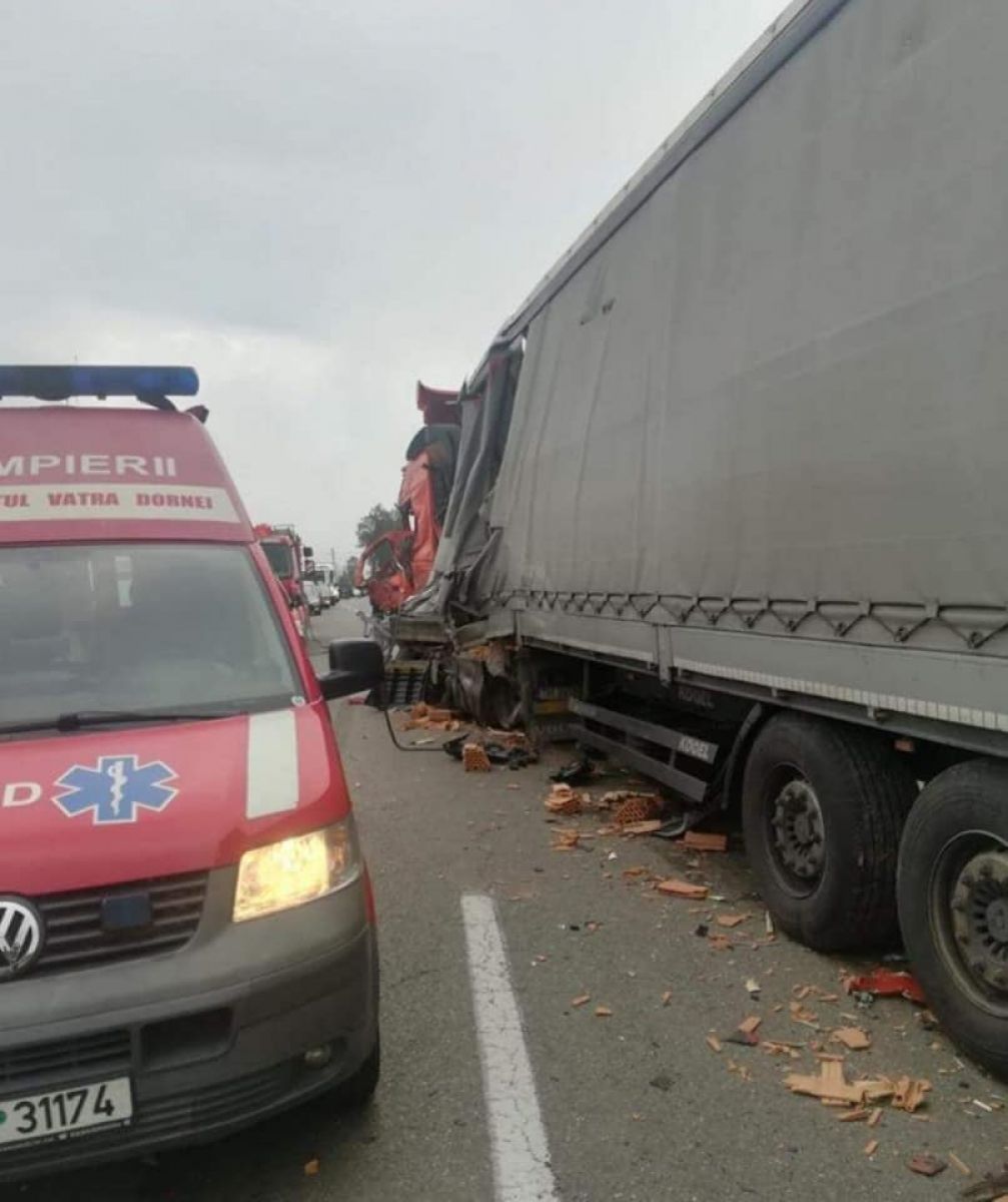Un autotren şi un autocamion s-au ciocnit violent, miercuri dimineaţă, în jurul orei 8.00, pe DN 17, la Poiana Stampei, în județul Suceava. Din primele cercetări ale polițiștilor dorneni rezultă că șoferul autotrenului încărcat cu cărămidă a intrat în depășirea unui camion din față, după o curbă, fără a se asigura suficient. Vehiculul greu a pătruns pe contrasens, de unde venea o autoutilitară pentru transport animale (de 7,5 tone) condusă de un bărbat din Botoșani, însoțit de un pasager.