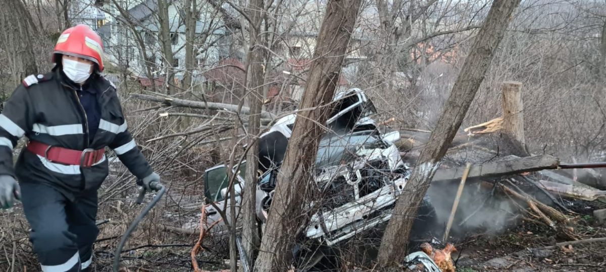 Un șofer de 23 de ani a făcut cascadorii cu mașina în trafic, după ce a pierdut controlul volanului. Mașina a ieșit de pe șosea, a acroșat un om al străzii, după care a căzut în gol în pantă și a luat toți copacii la rând.