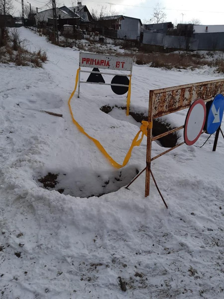 ”Pentru domnii de la Primăria Botoșani, ați uitat semnele ce indică un pericol pe str. Barbu Lăzăreanu!! Nu de alta, dar stau de două luni acolo, poate aveți alte șantiere mai noi!! Nu se mai pune problema dacă vor fi acoperite cu zăpadă gropile este un pericol major pentru toți!”.