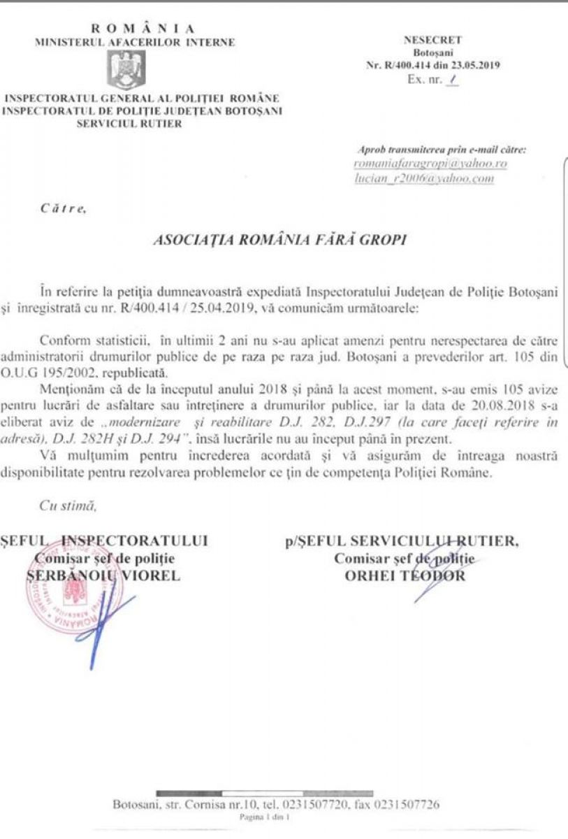 Adresa este semnată de șefii IPJ și ai Serviciului Rutier, comisarii șefi Viorel Șerbănoiu și Teodor Orhei și face referire directă și la cele două drumuri menționate în scrisoarea Asociației România fără Gropi.
