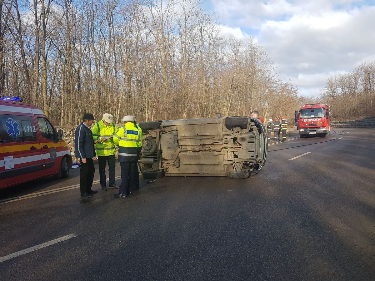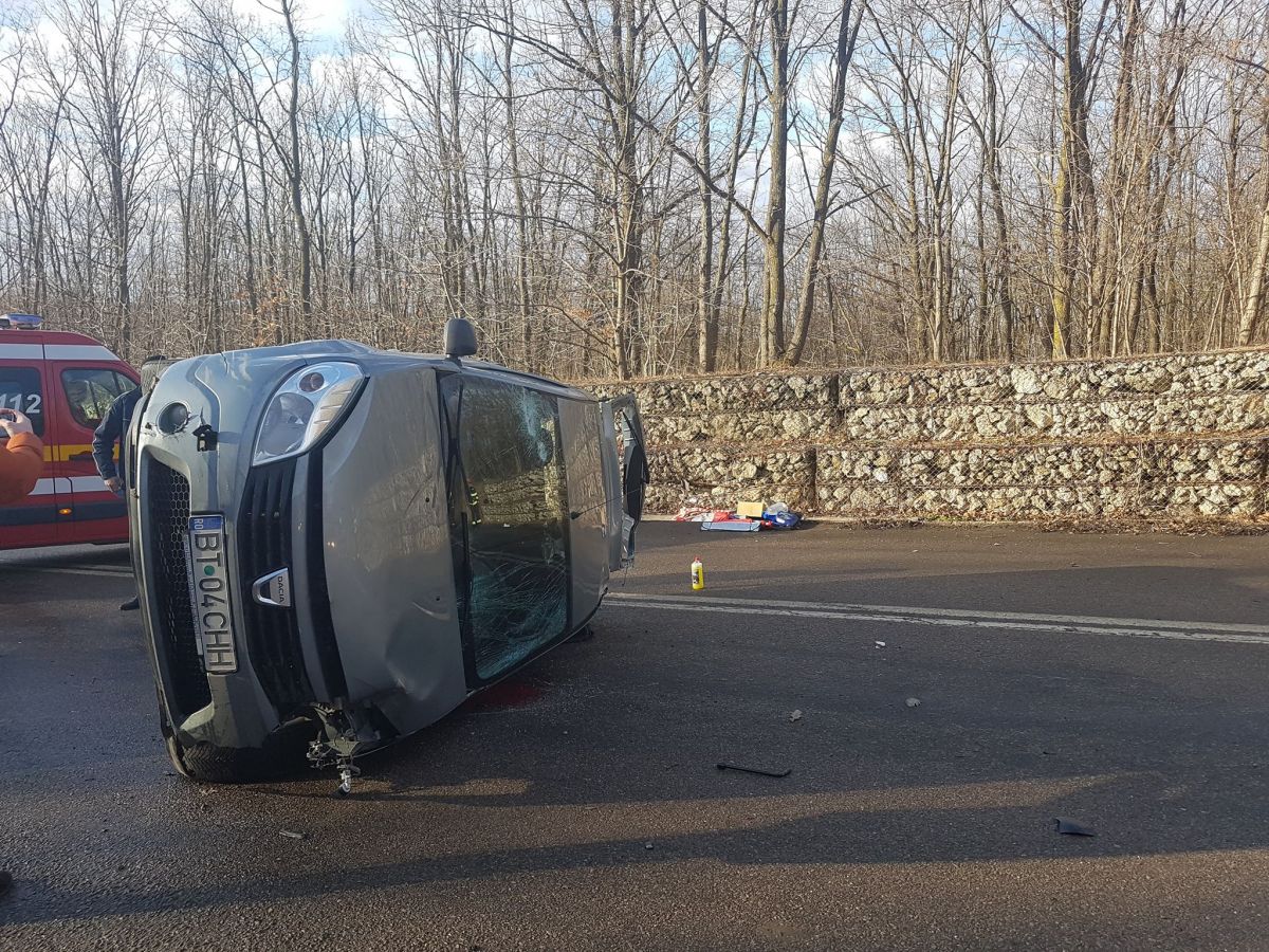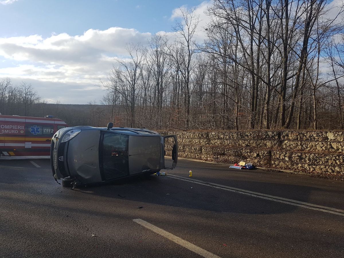 O conducătoare auto în vârstă de 55 de ani s-a răsturnat cu mașina marca Dacia.