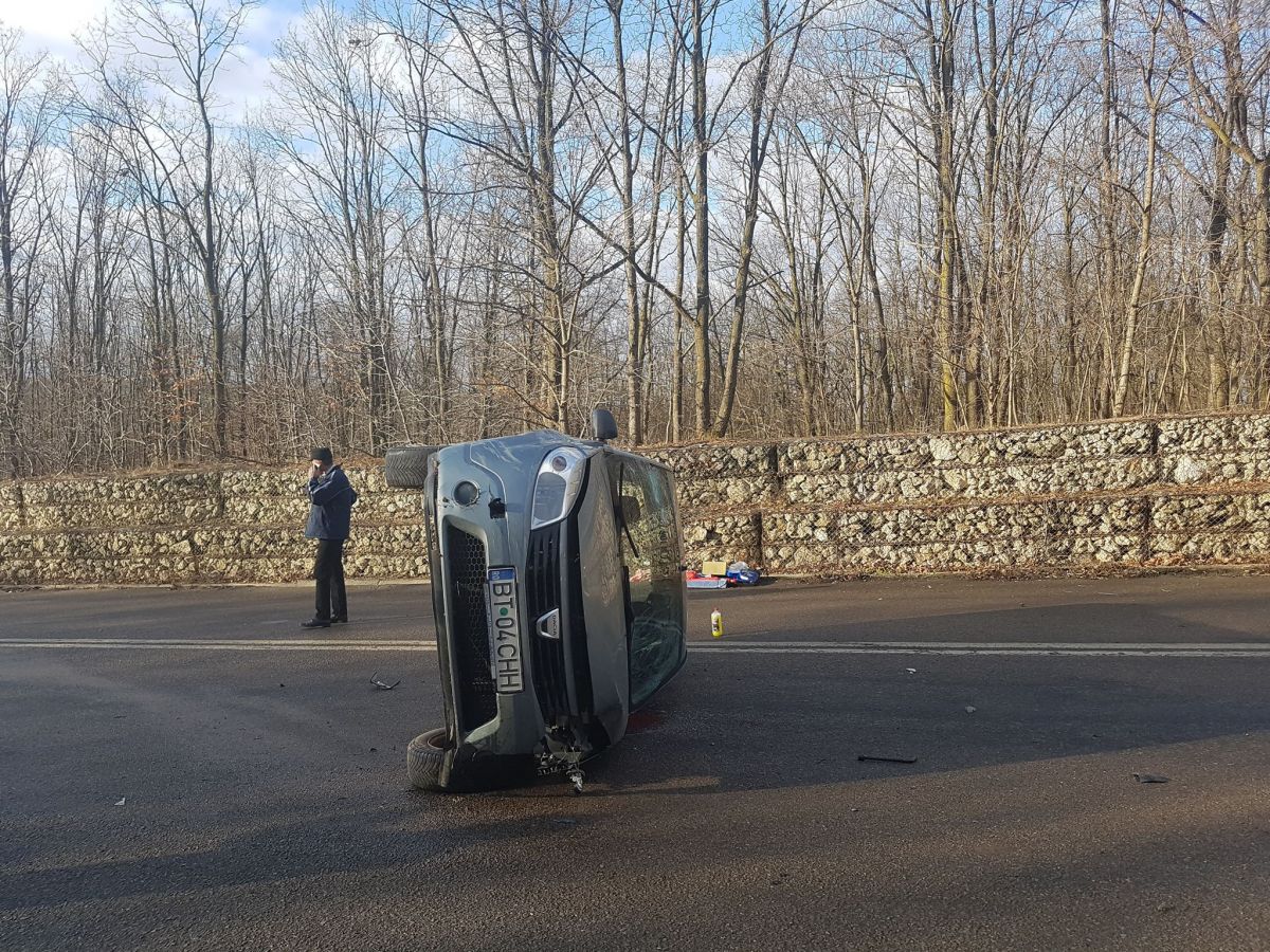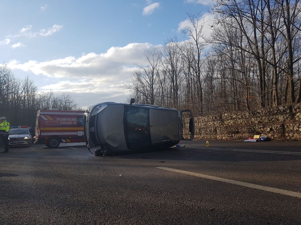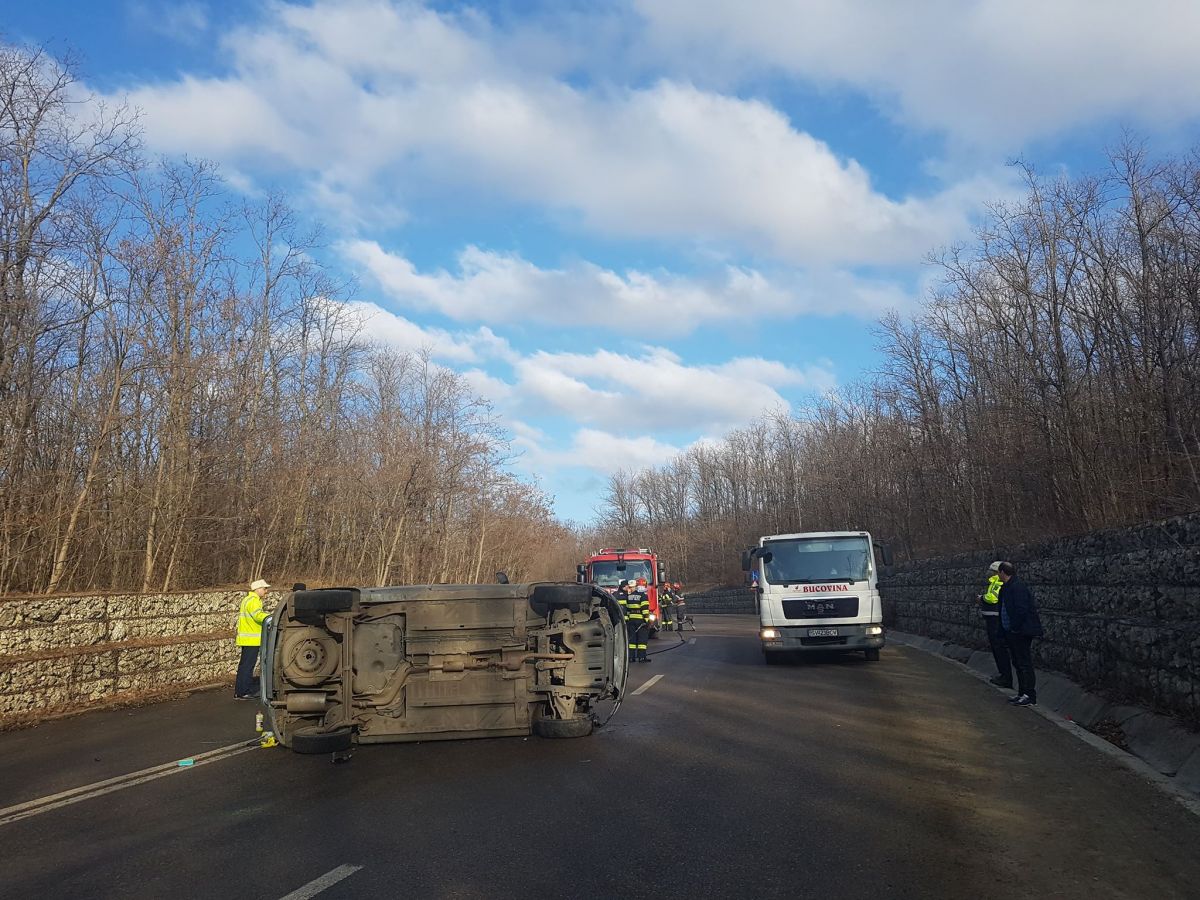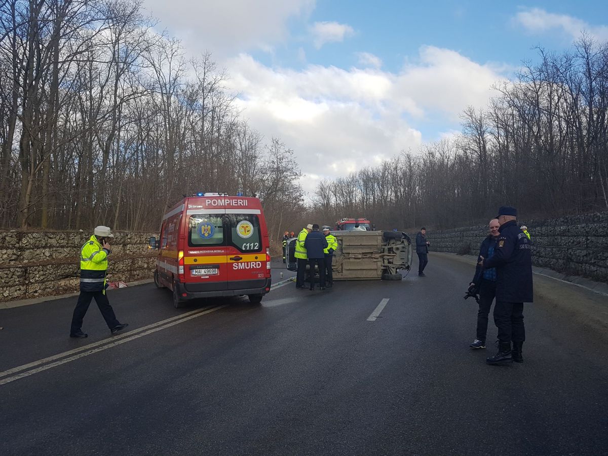 O conducătoare auto în vârstă de 55 de ani s-a răsturnat cu mașina marca Dacia.