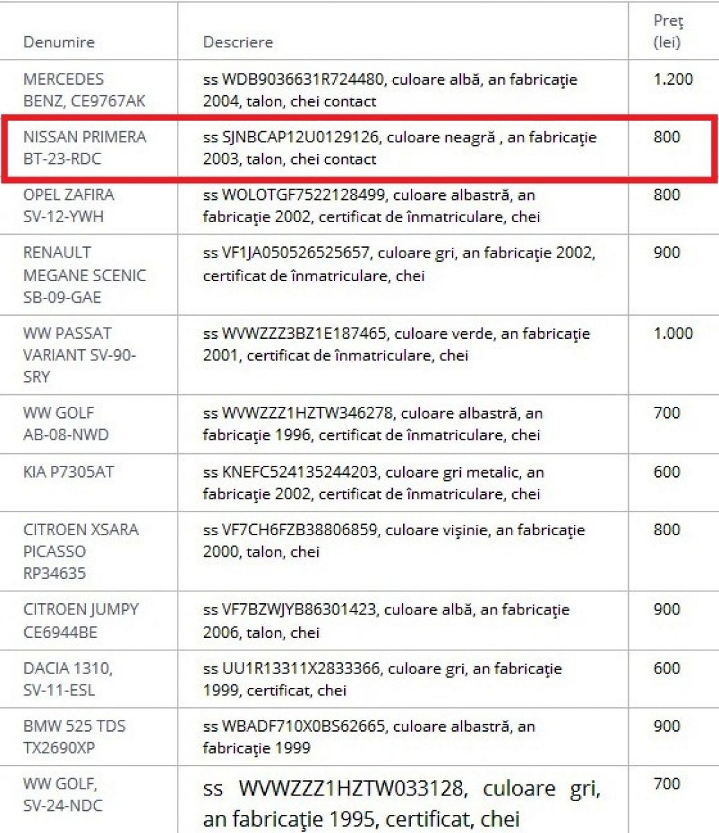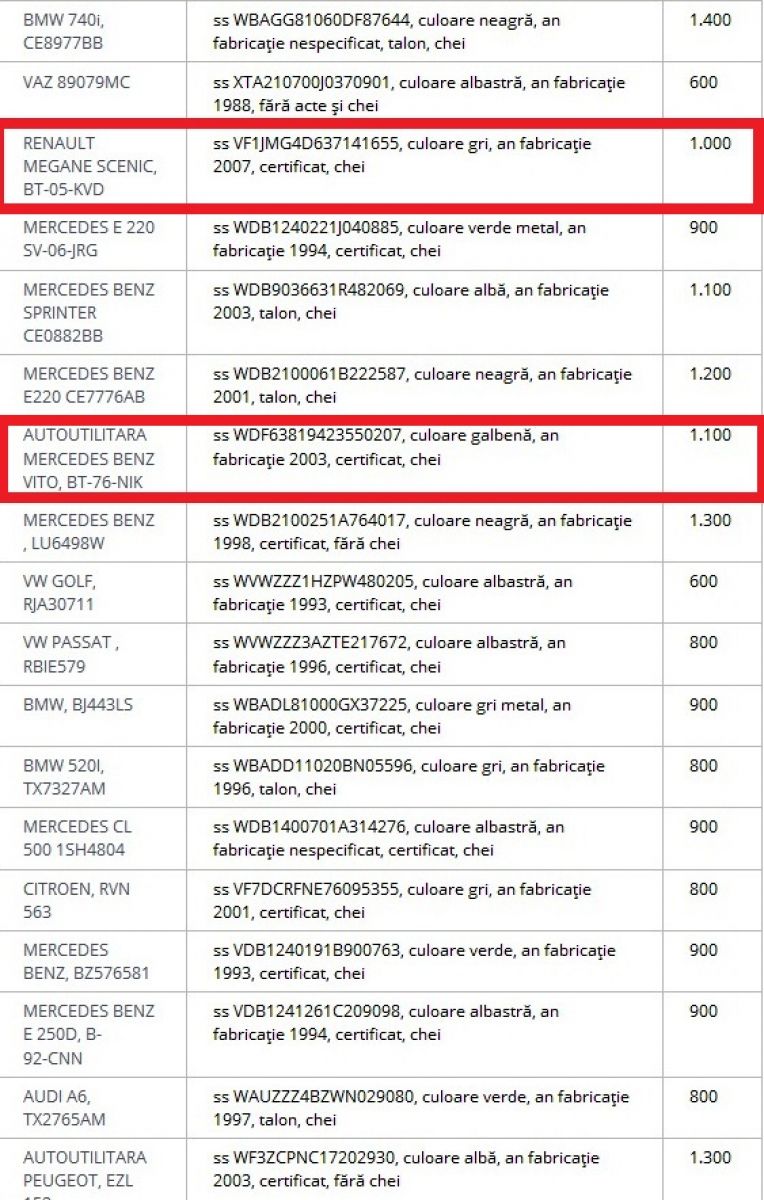 Este vorba despre un Nissan Primera fabricat în 2003 care costă 800 de lei, de un Renault Megane din 2007 evaluat la 1.000 lei şi de un Mercerdes Vito din 2003 care poate fi achiziţionat cu 1.100 lei.