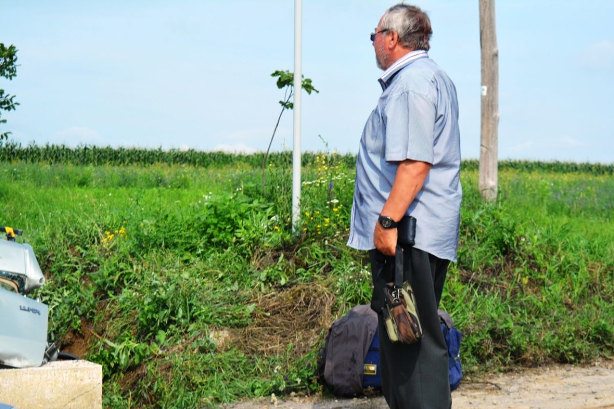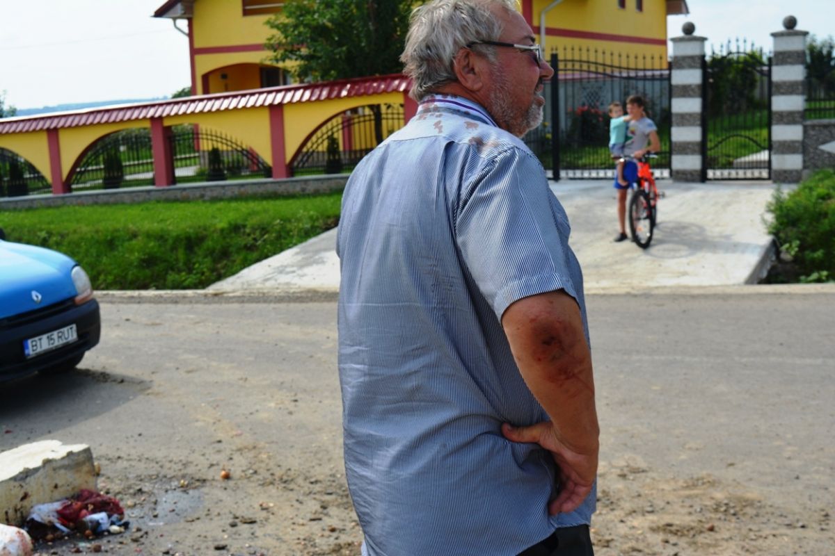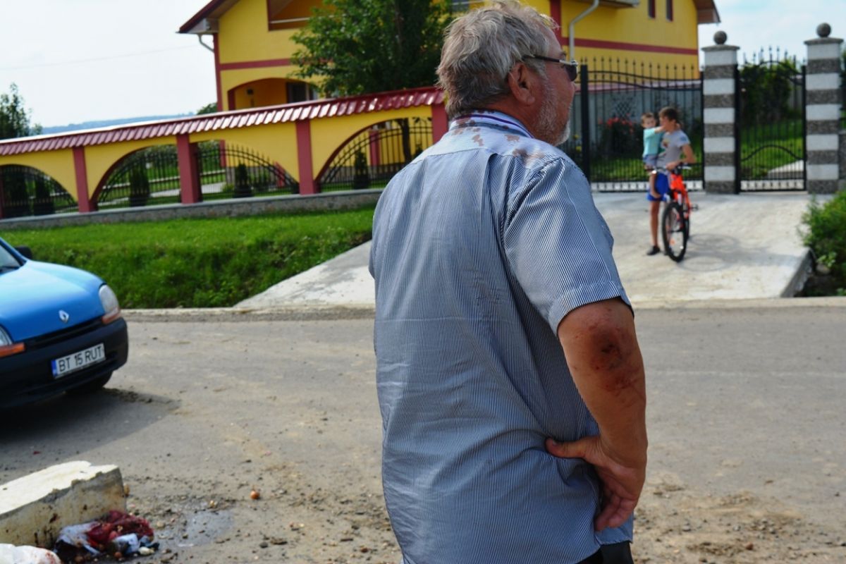 La câteva minute de producerea evenimentului rutier, bărbatul cu vârsta în jur de 50 de ani, cu sânge pe cămașă și pe brațe, se uita la mașina distrusă parcă fără să-i vină a crede.