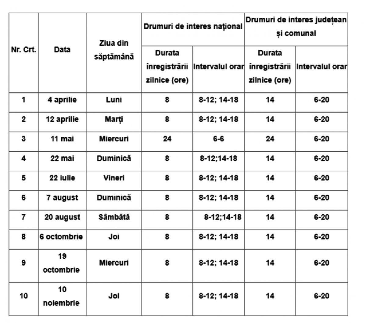 Recensământul se va desfăşura pe parcursul a şapte zile în lunile cu trafic mediu, aprilie, mai, octombrie, noiembrie, şi trei zile în iunie, iulie şi august când traficul are valori foarte mari.
