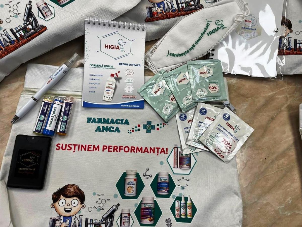 Astfel că a furnizat organizatorilor kit-uri complete pentru 65 de cadre didactice și elevi care cuprind, printre altele, dezinfectant, șervețele, biluțe contra răcelii și gripei, produse chiar de Anca farm și HIGIAnca.