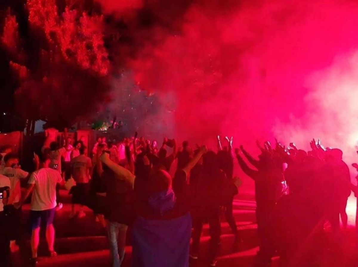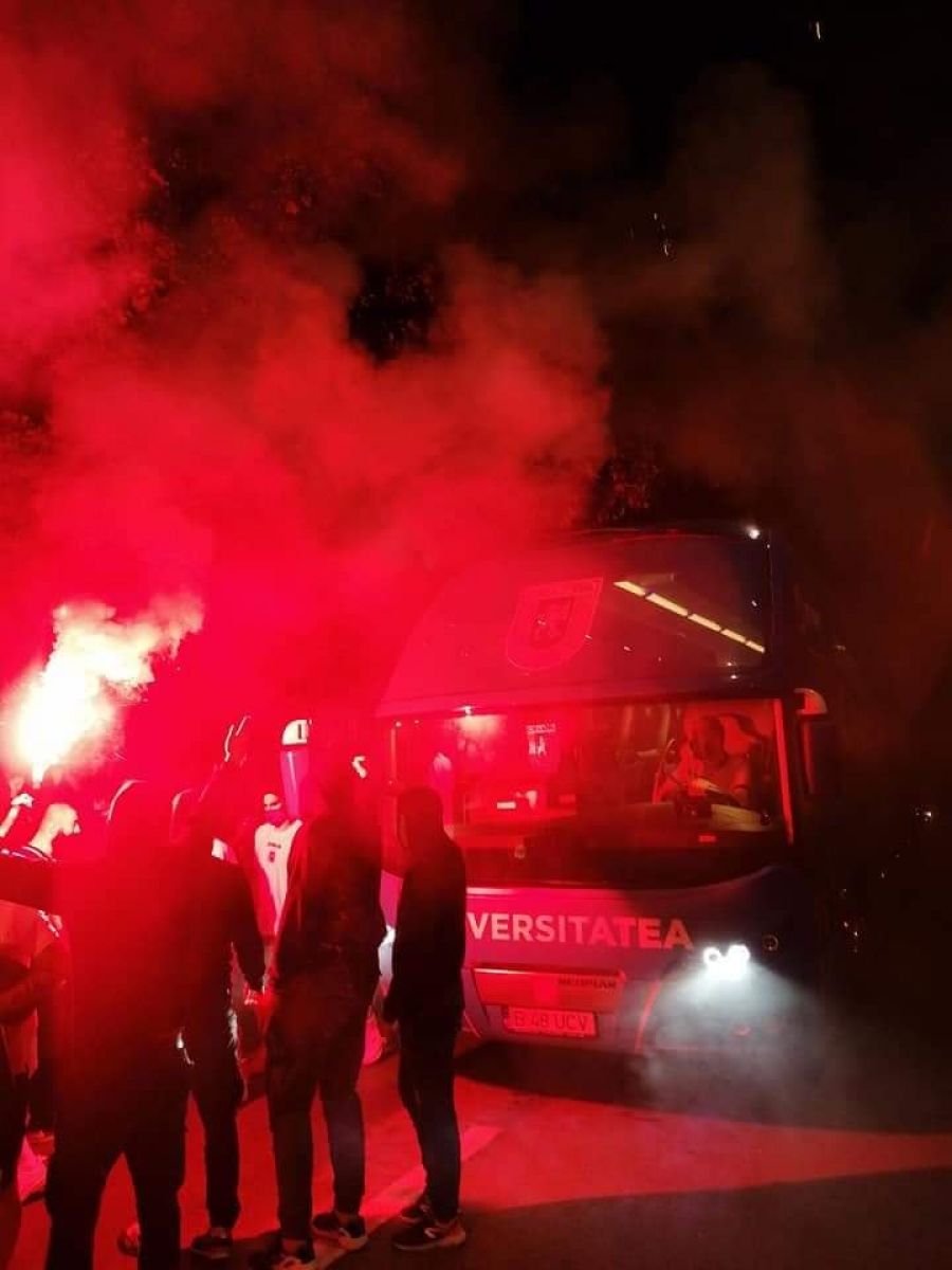 După meci, suporterii au așteptat autocarul Craiovei la intrarea în cantonament, într-o explozie de lumini de fumigene și scandări.