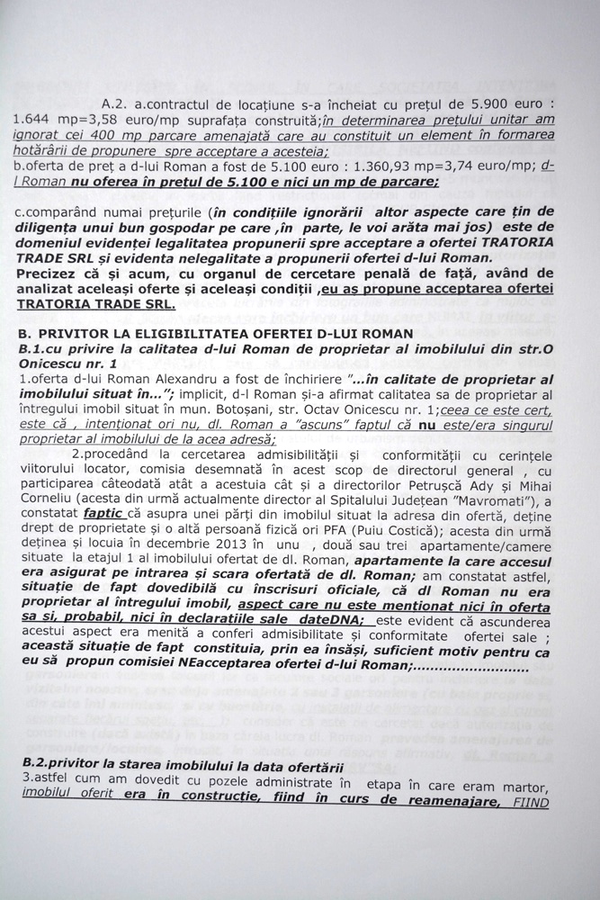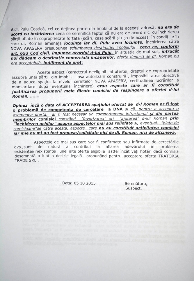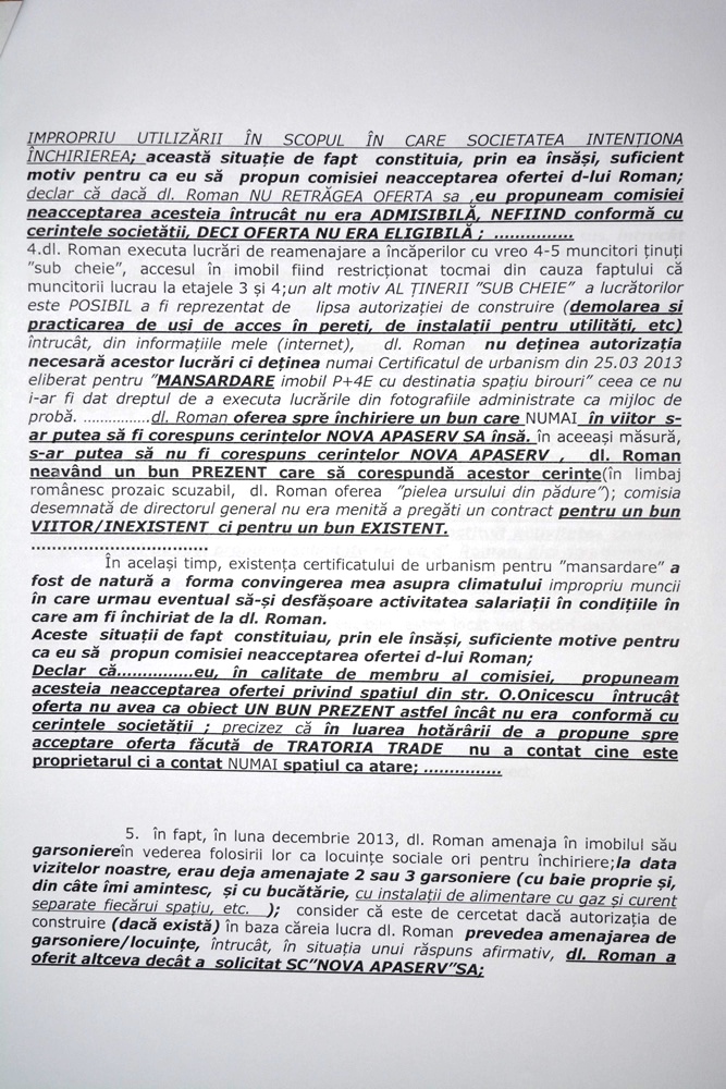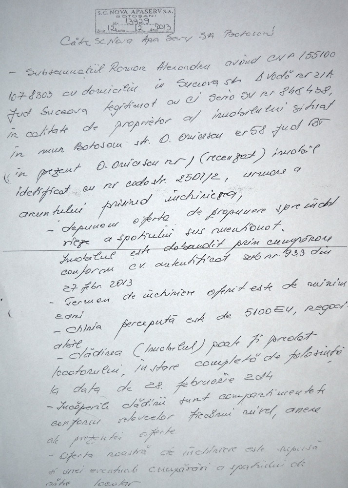 Procurorii anticorupție au depistat că acea comisie constituită la nivelul companiei de apă și canalizare și din care făcea parte și Neculai Gheorghincă, pe atunci director adjunct, a acceptat o ofertă mai scumpă. Astfel, oferta făcută de SC Tratoria Trade SRL era de 5.900 euro/lună, în timp ce Alexandru Roman propunea 5.100 euro/lună. Este nimeni altul decât suceveanul care în 2013 a cumpărat cu cash fostul sediu al SC Ascon SA situat chiar lângă imobilul în care SC Nova Apaserv SA își desfășura activitatea și pe care a plătit în jur de 900.000 de lei. De la oferta acestuia, scrisă de mână și pe care o puteți vedea în facsimilul de mai jos, au plecat o mulțime de probleme.
